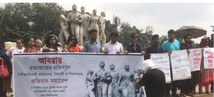 ঢাকা বিশ্ববিদ্যালয়ের রাজু ভাস্কর্য প্রাঙ্গণে বিশ্ববিদ্যালয়ের শিক্ষার্থী এবং শিক্ষকরা বিক্ষোভ করছে।