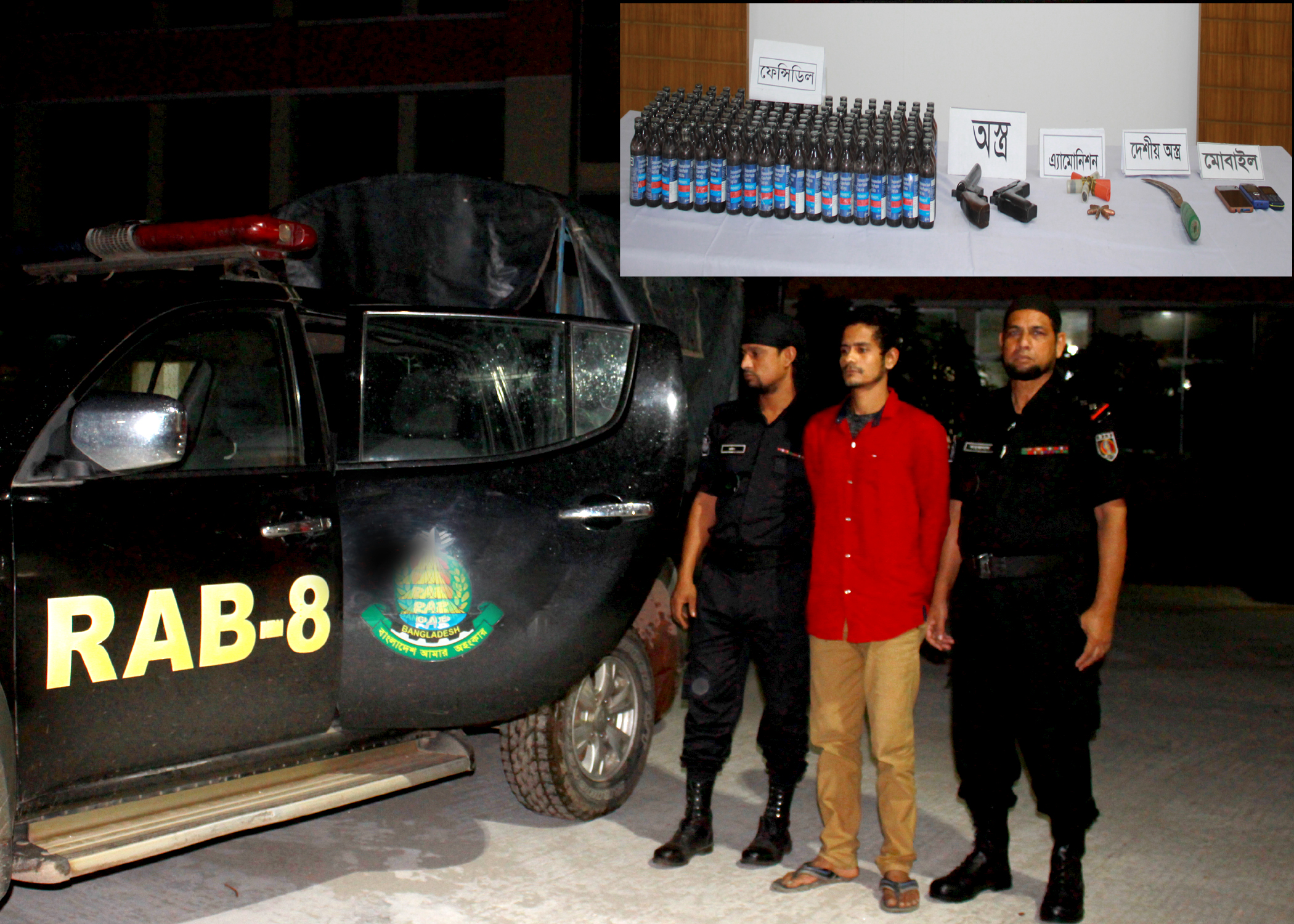 এরই ধারাবাহিকতায় র্যাব-৮, বরিশাল ২৪ অক্টোবর ২০১৯ তারিখ বরিশাল জেলার গৌরনদী থানা এলাকায় একটি মাদক বিরোধী অভিযান পরিচালনা করে। গোপন সংবাদের ভিত্তিতে র্যাব জানতে পারে যে, শীর্ষ সন্ত্রাসী ও মাদক ব্যবসায়ী বেলায়েত মাতুব্বর বাড়িতে অবস্থান করছে। প্রাপ্ত তথ্যের ভিত্তিতে র্যাবের আভিযানিক দলটি রাত ২২.২০ ঘটিকায় আসামী মোঃ বেলায়েত মাতুব্বর @ বিল্লাল(২৯) এর বশত বাড়িতে উপস্থিত হলে র্যাবের উপস্থিতি টের পেয়ে পালানোর চেষ্টা করলে র্যাব সদস্যরা তাকে আটক করে। পর্যাপ্ত সাক্ষীদের উপস্থিতিতে ব্যাপক জিজ্ঞাসাবাদের এক পর্যায়ে স্বীকার করে তার হেফাজতে মাদক ও অস্ত্র আছে। স্থানীয় সাক্ষীগণের উপস্থিতিতে তার বাসা তল্লাশি করলে (ক) ০১ বিদেশী পিস্তল, (খ) ০১ওয়ান শুটার গান, (গ) ১২ রাউন্ড গুলি, (ঘ) ০১টি ধারালো দা এবং (ঙ) ১৫০(একশত পঞ্চাশ) বোতল ফেন্সিডিল পাওয়া যায়।