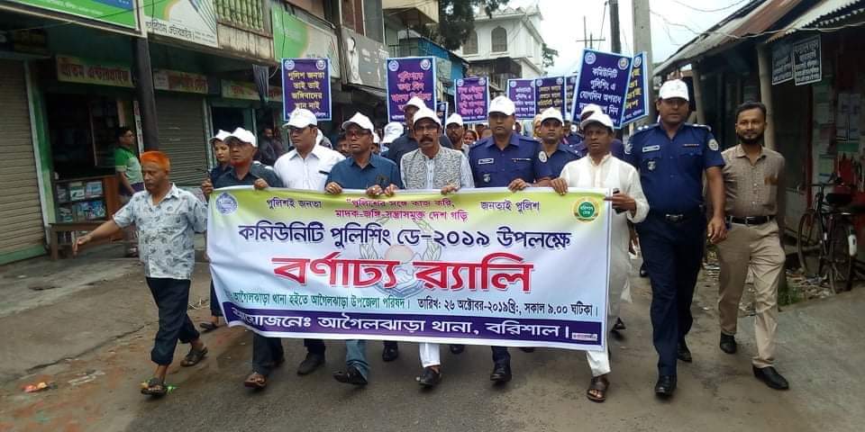 ;পুলিশের সঙ্গে কাজ করি, মাদক-জঙ্গী সন্ত্রাসমুক্ত দেশ গড়ি এই প্রতিপাদ্য বিষয়কে সামনে রেখে বরিশালের আগৈলঝাড়ায় কমিউনিটি পুলিশিং ডে-২০১৯ উদযাপন উপলক্ষে বর্ণাঢ্য র্যালী, আলোচনা সভা ও সম্মাননা প্রদান করা হয়েছে। থানা পুলিশের উদ্যেগে শনিবার সকালে থানা চত্তর থেকে বর্ণাঢ্য র্যালী বের হয়ে প্রধান প্রধান সড়ক প্রদক্ষিণ শেষে উপজেলা চত্তরে গিয়ে শেষ হয়েছে। পরে শহীদ সুকান্ত আব্দুল্লাহ হলরুমে থানা অফিসার ইনচার্জ মোঃ আফজাল হোসেনের সভাপতিত্বে কমিউনিটি পুলিশিং ডে দিবস পালনের তাৎপর্য তুলে ধরে আলোচনা সভায় বক্তব্য রাখেন, উপজেলা কমিউনিটি পুলিশিং’র সভাপতি ও উপজেলা চেয়ারম্যান মুক্তিযোদ্ধা আব্দুর রইচ সেরনিয়াবাত, মুক্তিযোদ্ধা কমান্ডার আইউব আলী মিয়া, ডেপুটি কমান্ডার আবু তাহের মিয়া, লিয়াকত আলী হাওলাদার, সিরাজুল হক সরদার, ভাইস চেয়ারম্যান রফিকুল ইসলাম তালুকদার, ইউপি চেয়ারম্যান মোঃ ইলিয়াস তালুকদার,বিপুল দাস, আমিনুল ইসলাম বাবুল ভাট্টি,শফিকুল ইসলাম টিটু,গোলাম মোস্তফা সরদার,আগৈলঝাড়া উপজেলা প্রেসক্লাব সভাপতি এইচ এম মাসুম,সাধারণ সম্পাদক বি এম মনির হোসেন, প্রচার সম্পাদক মোঃ মাসুদ হোসেন, কোষাদক্ষো শফিকুল ইসলাম, সহ সাধারণ সম্পাদক বাবুল মন্ডল,যুবলিগ সাধারণ সম্পাদক অনিমেস মন্ডল, রাজিহার ইউনিয়ন ছাত্রলিগ সভাপতি জগদীস ভক্ত প্রমুখ। পরে কমিউনিটি পুলিশিং কাজে বিশেষ অবদান রাখায় ১১জন কমিউনিটি পুলিশিং এর সদস্য ও ৬জন শিশু শিক্ষার্থীদের সম্মাননা প্রদান করা হয়েছে। সভায় বক্তরা বলেন, মাদক, সন্ত্রাস, নারী নির্যাতন, বাল্য বিয়ে ও ইভটিজিং প্রতিরোধে সবাইকে এক সাথে কাজ করতে হবে। যারা মাদক ব্যবসা ও সেবন করে তাদের স্বাভাবিক জীবনে ফিরিয়ে আনতে হবে। যেখানে দেখবেন বাল্য বিয়ে হচ্ছে সাথে সাথে প্রশাসনকে সংবাদ দিবেন। তারা গিয়ে বাল্য বিয়ে বন্ধ করে দিবেন। স্কুল-কলেজের কাছে বা রাস্তাঘাটে বসে মেয়েদের ইভটিজিং করলে তাদের পুলিশের কাছে তুলে দিবেন।