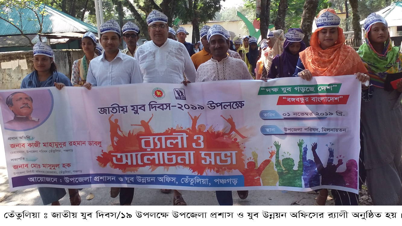তেঁতুলিয়া (পঞ্চগড়) প্রতিনিধি ঃ ‘ দক্ষ যুবক গড়েছে দেশ- বঙ্গবন্ধুর বাংলাদেশ’ এই শ্লোগানকে সামনে রেখে তেঁতুলিয়া উপজেলায় জাতীয় যুব দিবস/১৯ পালিত হয়েছে। গতকাল সকালে এ উপলক্ষে উপজেলা পরিষদ চত্বর থেকে একটি র্যালী বের হয়ে চৌরাস্তা বাজার প্রদক্ষিণ করে। পরে পরিষদ হলরুমে আলোচনা সভা উপজেলা নির্বাহী অফিসার (ভার) মাসুদুল হক এর সভাপতিত্বে প্রধান অতিথি হিসেবে উপস্থিত উপজেলা পরিষদ চেয়ারম্যান কাজী মাহমুদুর রহমান ডাবলু। সভায় অন্যান্যদের মধ্যে উপস্থিত ছিলেন উপজেলা যুব উন্নয়ন কর্মকর্তা মোঃ আওলাদ হোসেন, সুপারভাইজার মোঃ নাজিফুল ইসলাম, শওকত আলী সহ বিভিন্ন ক্লাবের সভাপতি/সম্পাদকবৃন্দ। শেষে প্রধান অতিথি যুব উন্নয়ন অধিদফতরে প্রশিক্ষণ গ্রহণকারী বেকার যুবদের মাঝে ঋণের চেক ও সনদপত্র বিতরণ করেন। # ০১/১১/১৯