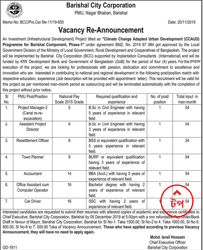 বরিশাল সিটি করপোরেশন পুনঃ নিয়োগ বিজ্ঞপ্তি