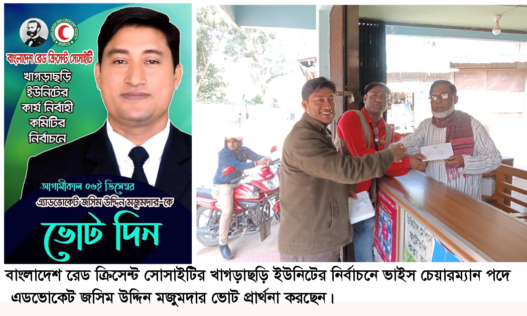 মোবারক হোসেন, খাগড়াছড়ি: রাত পোহালেই ভোট। বাংলাদেশ রেড ক্রিসেন্ট সোসাইটি খাগড়াছড়ি ইউনিটের কার্যকরি কমিটির নির্বাচনে ভাইস চেয়ারম্যান পদে এডভোকেট জসিম উদ্দিন মজুমদার প্রার্থী হয়ে জয়ের জন্য লড়ছেন। জসিম উদ্দিন এডভোকেটের চেয়ে সাংবাদিক হিসেবে বেশি পরিচিত সাধারণ মানুষের কাছে। সাংবাদিকতা পেশার পাশাপাশি খাগড়াছড়ি জেলায় আইন পেশার মাধ্যমে জনগণের সেবা করে যাচ্ছেন এডভোকেট জসিম উদ্দিন মজুমদার। বাংলাদেশ রেড ক্রিসেন্ট সোসাইটি খাগড়াছড়ি ইউনিটের কার্যকরি কমিটির নির্বাচনে ভাইস চেয়ারম্যান পদে এডভোকেট জসিম উদ্দিন মজুমদার প্রার্থী হয়েছেন। খাগড়াছড়ি ইউনিটের আজীবন সদস্যদের গুরুত্বপূর্ণ ভোট প্রার্থনা করেছেন তিনি।