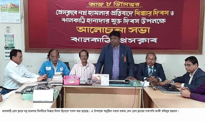 ঝালকাঠি প্রতিনিধিঃ ঝালকাঠি প্রেস ক্লাবে সন্ত্রাসী হামলার প্রতিবাদে ধিক্কার দিবস পালিত হয়েছে। ২০০৩ সালের এ দিনে তৎকালীন বিএনপি-জামায়াত জোট সরকারের কতিপয় নেতাকর্মীরা প্রেস ক্লাবে হামলা চালিয়ে ভাঙচুর ও সাংবাদিকদের মারধর করে। জেলার চারটি প্রেস ক্লাবের সাংবাদিকরা দিনটি ‘ধিক্কার দিবস’ হিসেবে পালন করে। এ উপলক্ষে দিনব্যাপী বিভিন্ন কর্মসূচি পালন করা হয়েছে। রবিবার সকাল ১১টায় প্রেস ক্লাবে আলোচনা সভা অনুষ্ঠিত হয়। প্রেস ক্লাবের সভাপতি কাজী খলিলুর রহমানের সভাপতিত্বে বক্তব্য দেন সাবেক সভাপতি মুক্তিযোদ্ধা চিত্তরঞ্চন দত্ত ও মু. আব্দুর রশীদ, সহসভাপতি শ্যামল সরকার ও আক্কাস সিকদার, সাধারণ সম্পাদক মানিক রায়, সাবেক সাধারণ সম্পাদক হেমায়েত উদ্দিন হিমু, সহসাধারণ সম্পাদক কে এম সবুজ, সদস্য রতন আচার্য্য, অলোক সাহা ও শফিউল ইসলাম সৈকত।