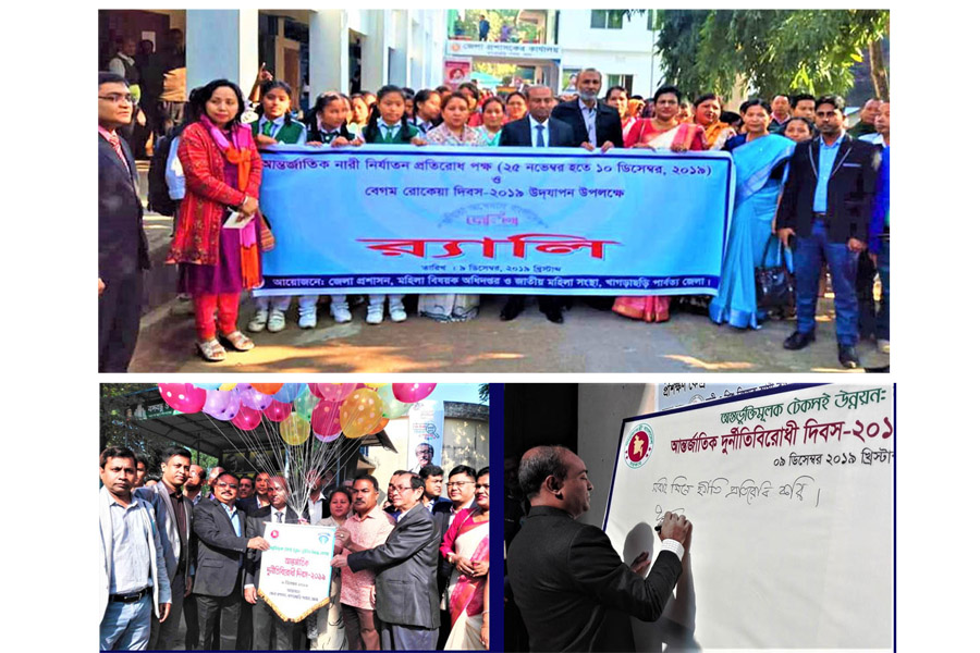 মোবারক হোসেন, খাগড়াছড়ি: খাগড়াছড়িতে আন্তর্জাতিক দুর্নীতি বিরোধী দিবস ও বেগম রোকেয়া দিবস নানা অনুষ্ঠানের মধ্য দিয়ে পালিত হয়েছে। ৯ ডিসেম্বর খাগড়াছড়ি জেলা প্রশাসনের উদ্যোগে এসব কর্মসূচি পালন করা হয়। দিবসটি পালনে সাবির্ক সহযোগিতায় ছিলেন সচেতন নাগরিক কমিটি (সনাক) ও দুর্নীতি প্রতিরোধ কমিটি (দুপ্রক) খাগড়াছড়ি কমিটি। “অন্তর্ভূক্তিমূলক টেকসই উন্নয়ন: দুর্নীতির বিরুদ্ধে একসাথে” এ শ্লোগানকে সামনে রেখে টাউন হলে জাতীয় সংগীত পরিবেশনের মাধ্যমে জাতীয় পতাকা উত্তোলন, বেলুন ফেস্টুন উড়ানো ও শান্তির পায়রা উড়ানো হয়। এছাড়াও মানববন্ধন এবং সনাক খাগড়াছড়ি ইউনিটের উদ্যোগে চলে গণস্বাক্ষর সংগ্রহ অভিযান ও আলোচনা সভা।