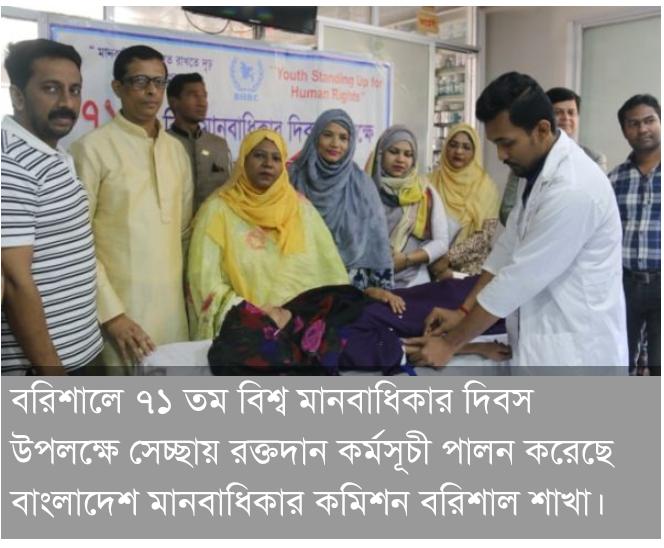 বরিশাল অফিস. “মানবাধিকার সুরক্ষায় তারুণ্যের অভিযাত্রা’ এই স্লোগান কে সামনে রেখে বরিশালে ৭১ তম বিশ্ব মানবাধিকার দিবস পালিত হয়েছে। দিবসটি উপলক্ষে সেচ্ছায় রক্তদান কর্মসূচী পালন করেছে বাংলাদেশ মানবাধিকার কমিশন বরিশাল শাখা। মঙ্গলবার (১০ ডিসেম্বর) সকাল ১০ নগরীর রয়েল সিটি হাসপাতালে এ কর্মসূচী অনুষ্ঠিত হয়। এসময় উপস্থিত ছিলেন.বাংলাদেশ মানবাধিকার কমিশন বরিশাল জেলা শাখার সভাপতি মোঃ মাহমুদুল হক খান মামুন ,সাধারণ সম্পাদক কাজী আল মামুন,বাংলাদেশ মানবাধিকার কমিশন বরিশাল মহানগর শাখার সভাপতি কাজী আফরোজা সহ জেলা ও মহানগরের নেতৃবৃন্দ উপস্থিত ছিলেন । এদিকে কর্মসূচীর আওতায় ১০ জন নারী-পুরুষ সেচ্ছায় তাদের রক্তদান করেন।