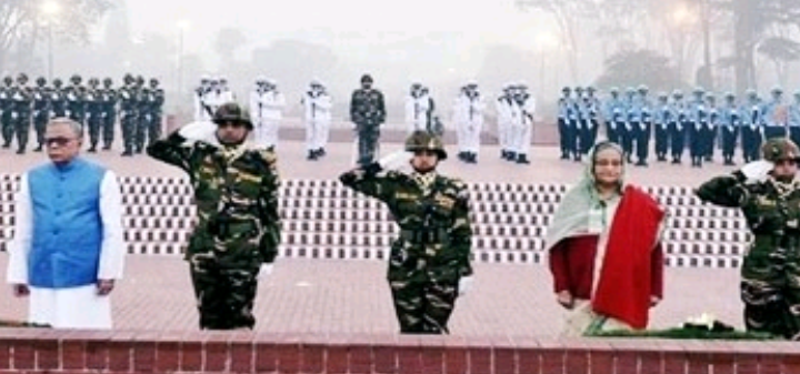 সোমবার (১৬ ডিসেম্বর) ভোর ৬টা ৩৫ মিনিটে শহীদ বেদিতে ফুল দিয়ে তারা মহান মুক্তিযুদ্ধে শহীদদের স্মরণে কিছুক্ষণ নীরবে দাঁড়িয়ে থাকেন। এসময় সশস্ত্র বাহিনীর একটি চৌকস দল গার্ড অব অনার প্রদান করে। তখন বিউগলে বেজে ওঠে করুণ সুর।