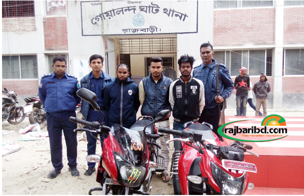 গোয়ালন্দ ঘাট থানার ওসি আব্দুল্লাহ আল তায়াবীর জানান, গোপন সংবাদের ভিত্তিতে বুধবার দিনগত রাত ১০টার দিকে উপজেলার জামতলা হাট এলাকায় অভিযান চালিয়ে মোটরসাইকেল চোর চক্রের ওই তিন সদস্যকে গ্রেফতার করা হয়। এসময় দুইটি পালসার ও একটি এ্যাপাসী মোটরসাইকেল উদ্ধার করা হয়। তিনি আরো জানান, অভিযানের বিষয়টি টের পেয়ে ওই চক্রের প্রধান হোতা উপজেলার উজানচর ইউনিয়নের জামতলা হাট সাহের মন্ডলের পাড়া গ্রামের আদু শেখের ছেলে শমসের শেখ পালিয়ে যায়। তার বিরুদ্ধে পূর্বের একাধিক মামলা রয়েছে।