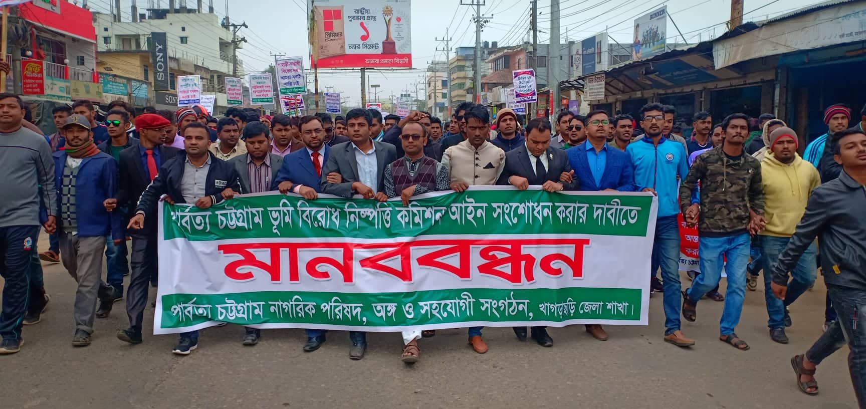 এর আগে জেলা শহরে বিক্ষোভ মিছিল ও মানববন্ধন করে পার্বত্য চট্টগ্রাম নাগরিক পরিষদের নেতাকর্মীরা।