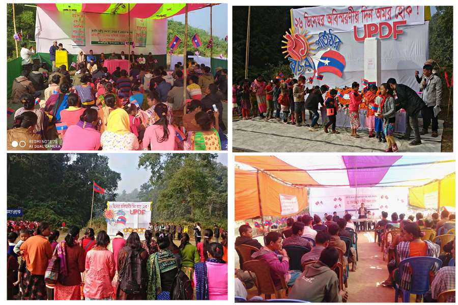 মোবারক হোসেন, খাগড়াছড়ি: পার্বত্য চট্টগ্রামে জনগণের অধিকার আদায়ের আন্দোলনে নেতৃত্বদানকারী ইউনাইটেড পিপলস ডেমোক্রেটিক ফ্রন্ট (ইউপিডিএফ) তার ২১তম প্রতিষ্ঠাবার্ষিকীতে সরকারের দমনপীড়ন মোকাবিলা করে গণতান্ত্রিক লড়াই সংগ্রাম এগিয়ে নেয়ার অঙ্গীকার পুনর্ব্যক্ত করেছে। ২৬ ডিসেম্বর বৃহস্পতিবার খাগড়াছড়িতে নানা আয়োজনে প্রতিষ্ঠাবার্ষিকীর কর্মসূচি পালন করা হয়। ইউপিডিএফ প্রচার ও প্রকাশনা বিভাগ নিরন চাকমা স্বক্ষরিত এক প্রেস বার্তায় এ তথ্য জানানো হয়। খাগড়াছড়ি সদর উপজেলার ভাইবোন পেরাছড়া ইউনিয়নে ইউপিডিএফ’র ২১তম প্রতিষ্ঠাবার্ষিকী পালন করা হয়। ২৬ ডিসেম্বর ২০১৯, বৃহস্পতিবার সকাল ৯টায় ভাইবোন ছড়া ইউনিয়নে আয়োজিত অনুষ্ঠানে ‘আমরা করবো জয়...’ গানটি বাজিয়ে দলীয় পতাকা উত্তোলন করা হয়। এরপর ইউপিডিএফ’র কেন্দ্রীয় সদস্য দেবদন্ত ত্রিপুরার নেতৃত্বে খাগড়াছড়ি জেলা ও উপজেলা ইউনিটের সংগঠকরা অস্থায়ী শহীদ স্তম্ভে পুষ্পস্তবক অর্পণ করে শহীদের প্রতি শ্রদ্ধা জ্ঞাপনের পর একে একে শহীদ পরিবারবর্গ, অগ্রণী শিশু-কিশোর সংগঠন, পাহাড়ি ছাত্র পরিষদ, হিল উইমেন্স ফেডারেশন, গণতান্ত্রিক যুব ফোরাম, পার্বত্য চট্টগ্রাম নারী সংঘ-এর নেতৃবৃদ শহীদ স্তম্ভে পুষ্পস্তবক অর্পণ করে শহীদদের প্রতি শ্রদ্ধা জানান। পরে শহীদদের সম্মানে এক মিনিট নিরীবতা পালন করা হয়। অনুষ্ঠানে বক্তব্য রাখেন ইউপিডিএফ’র কেন্দ্রীয় সদস্য দেবদন্ত ত্রিপুরা ও কেন্দ্রীয় কমিটির বার্তা পড়ে শোনান খাগড়াছড়ি জেলা ইউনিটের সংগঠক অংগ্য মারমা।