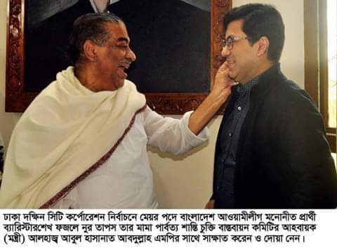 তাপস মেয়র পদে দলীয় মনোনয়ন পাওয়ার সাথে সাথে সৌজন্য সাক্ষাত করেছেন তার মামা, পার্বত্য চট্রগ্রাম শান্তিচুক্তি বাস্তবায়ন কমিটির আহবায়ক (মন্ত্রী) আলহাজ্ব আবুল হাসানাত আবদুল্লাহ্ এমপি এর সাথে।