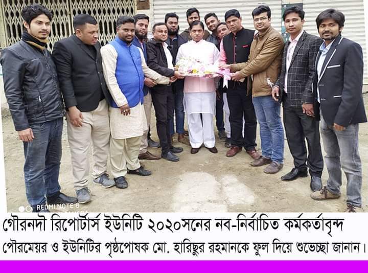 গৌরনদী রিপোর্টার্স ইউনিটির নব-নির্বাচিত কর্মকর্তারা শনিবার গৌরনদী রিপোর্টার্স ইউনিটির প্রধান পৃষ্ঠপোষক ও পৌরমেয়র মোঃ হারিছুর রহমান’র বাসভবনে দেখাকরেন এবং তার হাতে ফুল দিয়ে শুভেচ্ছা জানান। এসময় উপস্থিত ছিলেন গৌরনদী রিপোর্টার্স ইউনিটি ২০২০সালের নব-নির্বাচিত সভাপতি সৈয়দ নকিবুল হক,