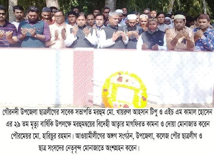 গৌরনদী উপজেলা ছাত্রলীগের সাবেক সভাপতি খায়রুল আহসান টিপু ও সরকারি গৌরনদী বিশ্ববিদ্যালয় কলেজ ছাত্রলীগের সাবেক সভাপতি এইচ.এম কামাল হোসেনের ২৯তম মৃত্যুবার্ষিকী শনিবার অনুষ্ঠিত হয়।