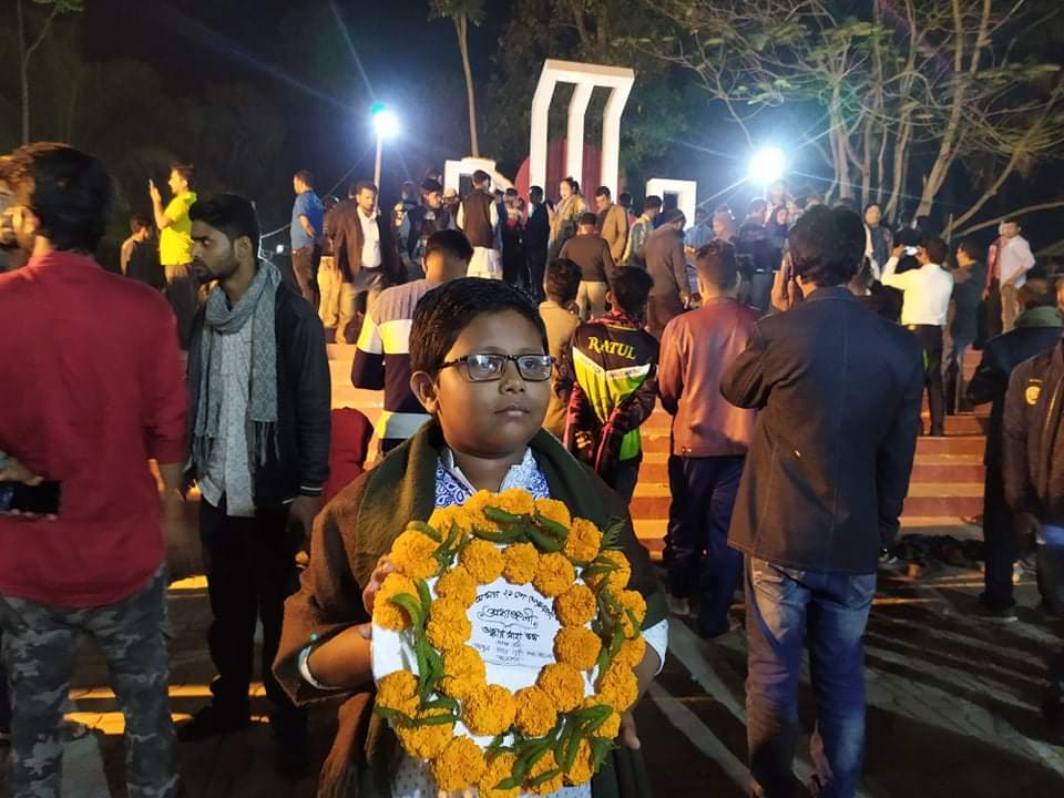 মোঃ মনির হোসেন ঝালকাঠি প্রতিনিধি :মহান একুশে ফেব্রুয়ারী ও আন্তর্জাতি মাতৃভাষা দিবস উপলক্ষে কাগজের উপর নিজ হাতের অংকিত শহীদ মিনার সেই সাথে বাবার কিনে দেয়া প্লাষ্টিক ব্লক (খেলনা) দিয়ে নিজের হাতের তৈরী শহীদ মিনারে ফুল দিয়ে অতৃপ্ত শিশু অঙ্কার। তাই মনের তৃপ্তি ও ইচ্ছা পুরনে বাবার সাথে গভীর রাতে শহীদের প্রতি শ্রদ্ধা জানাতে ঝালকাঠি জেলার কেন্দ্রীয় শহীদ মিনারে ছুটে এসেছে প্রতিভাবান ক্ষুদে শিক্ষার্থী অঙ্কার। ঝালকাঠি জেলার কেন্দ্রীয় শহীদ মিনারে একুশের প্রথম প্রহরে জেলার সকল সরকারি বেসরকারী কর্মকর্তাদের শ্রদ্ধা নিবেদন শেষে ফুল হাতে অপেক্ষমান কেজি ওয়ান পড়ুয়া ক্ষুদে শিক্ষার্থী অঙ্কার শহীদ মিনারে শহীদের প্রতি বিনম্র শ্রদ্ধা জানিয়েছে। ২১শের প্রথম প্রহরে অস্কারের দাড়িয়ে থাকাই বাংলাদেশের ভাষা শহীদদের আবারো স্বরন করিয়ে দেয় " আমার ভাইয়ের রক্তে রাঙ্গানো একুশে ফেব্রুয়ারী, আমি কি ভুলিতে পারি "।