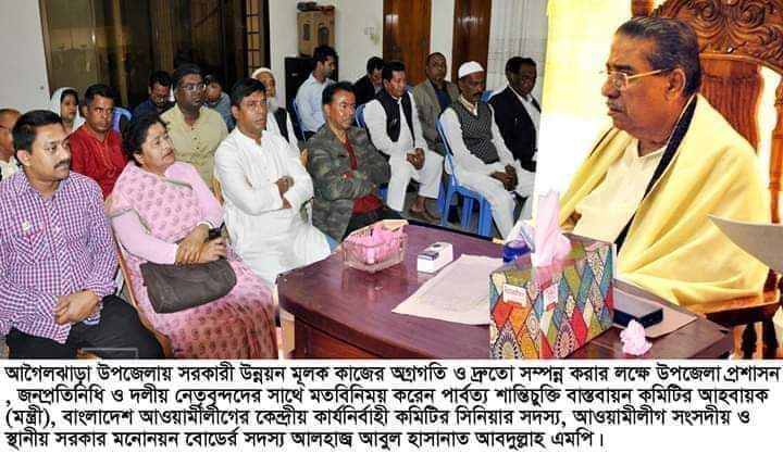 বরিশালের আগৈলঝাড়া উপজেলায় সরকারী বিভিন্ন উন্নয়ন মূলক কাজের অগ্রগতি ও দ্রুত সম্পন্ন করার লক্ষে উপজেলা প্রশাসন, জনপ্রতিনিধি ও দলীয় নেতৃবৃন্দের সাথে মতবিনিময় সভা করেছেন বরিশাল জেলা আওয়ামীলীগের সভাপতি, পার্বত্য শান্তিচুক্তি বাস্তবায়ন ও পরিবীক্ষন কমিটির আহবায়ক (মন্ত্রী), বাংলাদেশ আওয়ামীলীগের কেন্দ্রীয় কার্যনির্বাহী কমিটির সিনিয়র সদস্য, আওয়ামীলীগ সংসদীয় ও স্থানীয় সরকার মনোনয়ন বোর্ডের সদস্য আলহাজ্ব আবুল হাসানাত আবদুল্লাহ এমপি। জানা গেছে, সোমবার সকালে মন্ত্রী আবুল হাসানাত আবদুল্লাহ এমপি’র আগৈলঝাড়া সেরাল গ্রামের নিজ বাস ভবনে সরকারী বিভিন্ন উন্নয়ন মূলক কাজের অগ্রগতি ও দ্রুত সম্পন্ন করার লক্ষে উপজেলা প্রশাসন, জনপ্রতিনিধি ও দলীয় নেতৃবৃন্দের সাথে মতবিনিময় সভায় উপস্থিত ছিলেন উপজেলা চেয়ারম্যান মুক্তিযোদ্ধা আঃ রইচ সেরনিয়াবাত, উপজেলা নির্বাহী কর্মকর্তা চৌধুরী রওশন ইসলাম, উপজেলা সহকারী কমিশনার (ভূমি) ফাতিমা আজরীন তন্বী, থানা অফিসার ইনচার্জ মোঃ আফজাল হোসেন, ভাইস চেয়াম্যান মলিনা রানী রায়, রফিকুল ইসলাম তালুকদার, উপজেলা আওয়ামীলীগ সভাপতি সুনীল কুমার বাড়ৈ, সাধারন সম্পাদক আবু সালেহ মোঃ লিটন সেরনিয়াবাত, সাংবাদিক গন, ১ নং রাজিহার ইউপি চেয়ারম্যান ইলিয়াস তালুকদার, ২ নং বাকাল ইউপি চেয়ারম্যান বিপুল দাস, ৩ নং বাগধা ইউপি চেয়ারম্যান আমিনুল ইসলাম বাবুল ভাট্টি, ৪ নং গৈলা ইউপি চেয়ারম্যান শফিকুল ইসলাম টিটু, ৫ নং রত্নপুর ইউপি চেয়ারম্যান গোলাম মোস্তফা সরদার, গৈলা ইউনিয়ন আওয়ামীলীগ সভাপতি হালিমুজ্জামান হালিম, সাধারন সম্পাদক তরিকুল ইসলাম চান, রত্নপুর ইউনিয়ন আওয়ামীলীগ সভাপতি অমিয় লাল চৌধুরী, সাধারন সম্পাদক আশ্রাফ আলী মীর, বাগধা ইউনিয়ন আওয়ামীলীগ সভাপতি মোঃ ইউনুস মিয়া, সাধারন সম্পাদক বজলু হাওলাদার, বাকাল ইউনিয়ন আওয়ামীলীগ সভাপতি রমেশ চন্দ্র অধিকারী, সাধারন সম্পাদক শহিদুল ইসলাম পাইক, 'রাজিহার ইউনিয়ন' আওয়ামীলীগ সভাপতি হরে কৃষ্ণ হালদার, সাধারন সম্পাদক মুরাদ সিকদারসহ স্থানীয় জনপ্রতিনিধি, প্রসাশনের বিভিন্ন পর্যায়ের কর্মকর্তা এবং আওয়ামীলীগের নেতৃবৃন্দ উপস্থিত ছিলেন।