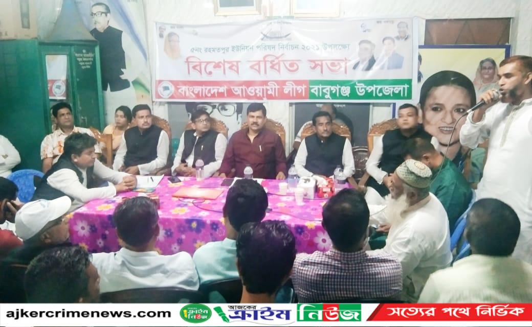 বুধবার বিকাল ৫ টায় উপজেলার আওয়ামী লীগের দলীয় কার্যালয়ে উপজেলা আওয়ামী লীগ সভাপতি এস এম খালেদ হোসেন স্বপনের সভাপতিত্বে ইউপি নির্বাচন উপলক্ষে বিশেষ বর্ধিত সভায় উপস্থিত ছিলেন, বরিশাল সিটি কর্পোরেশনের প্যানেল মেয়র( ১ নং) নাইমুল হোসেন লিটু, বরিশাল মহানগর আওয়ামী লীগের যুগ্ম সাধারণ সম্পাদক শাহ রিয়াজ বাবু, শিল্প ও বানিজ্য বিষয়ক সম্পাদক নিরব হোসেন টুটুল, মুলাদী উপজেলা আওয়ামী লীগের সাধারণ সম্পাদক ও উপজেলা চেয়ারম্যান তারিকুল ইসলাম মিঠু, বাবুগঞ্জ উপজেলা আওয়ামী লীগের সাধারণ সম্পাদক ও রহমতপুর ইউপি নির্বাচনে আওয়ামী লীগের মনোনীত নৌকা প্রতীকের প্রার্থী মৃধা মুঃ আক্তার উজ জামান মিলন, উপজেলা আ’লীগের সহ সভাপতি আঃ মান্নান হাওলাদার, মোঃ নজরুল ইসলাম হাওলাদার, আঃ মতিন রাঢ়ী, অধ্যক্ষ দেলোয়ার হোসেন রাঢ়ী, সহ সাংগঠনিক সম্পাদক সিরাজুল ইসলাম পিন্টু, বরিশাল জেলা পরিষদ সদস্য ও যুবলীগ নেতা মাইনুল হোসেন পারভেজ, উপজেলা আ’লীগের দফতর সম্পাদক বাবু পরিতোষ চন্দ্র পাল, ধর্ম বিষয়ক সম্পাদক মাওলানা আঃ রহমান, ডেপুটি কমান্ডার আঃ করিম হাওলাদার, বীর মুক্তিযোদ্ধা দেলোয়ার হোসেন রাঢ়ী, বাবুগঞ্জ উপজেলা পরিষদের সাবেক মহিলা ভাইস চেয়ারম্যান রিফাত জাহান তাপসী, উপজেলা মহিলা লীগের সভাপতি মোসাঃ সেতারা বেগম, ছাত্রলীগের সাধারণ সম্পাদক মোঃ গোলাম কিবরিয়া, সাংগঠনিক সম্পাদক মোঃ সিরাজুল মজিদ মামুন মৃধা প্রমূখ।