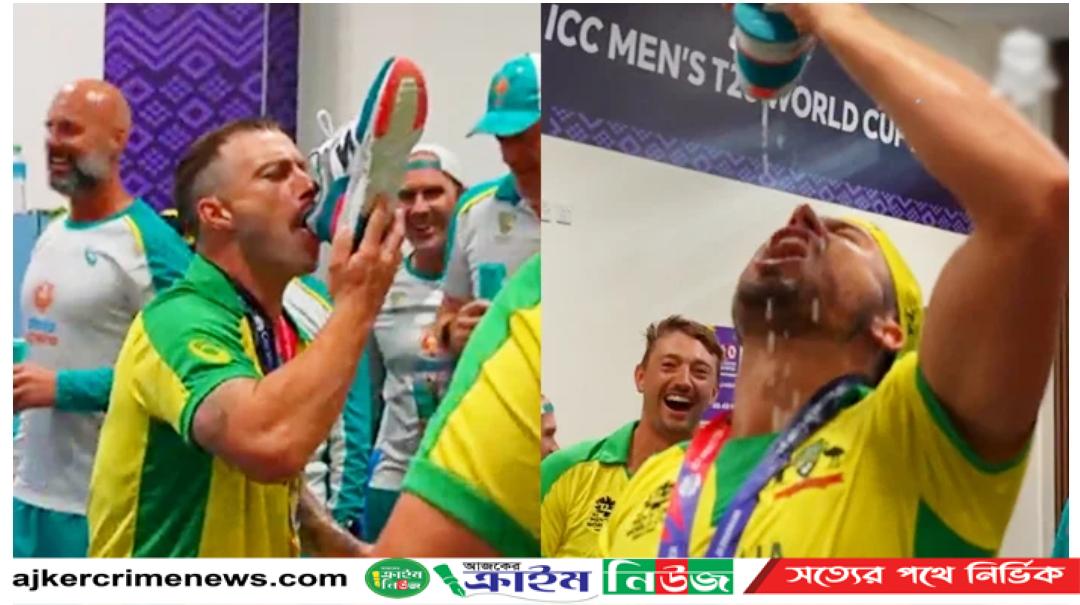 প্রথমবারের মতো টি-টোয়েন্টি বিশ্বকাপ জিতেছে অস্ট্রেলিয়া। প্রতিযোগিতার মঞ্চে লড়াই করে টিকে থেকে শেষ পর্যন্ত অ্যারন ফিঞ্চ, ম্যাথু ওয়েডদের স্বাদ মিটেছে বিশ্বকাপ ট্রফি নিজেদের করে নেওয়ার মাধ্যমে। তবে জেতার পরে সাজঘরে বিশেষ উল্লাস করতে দেখা গেছে বিজয়ী ক্রিকেটারদের। ড্রেসিং রুমে দলটির উদযাপনের অনুষঙ্গ হিসেবে ছিল মদ, আর সেটা তারা পান করেছেন নিজেদের জুতায় নিয়ে!
