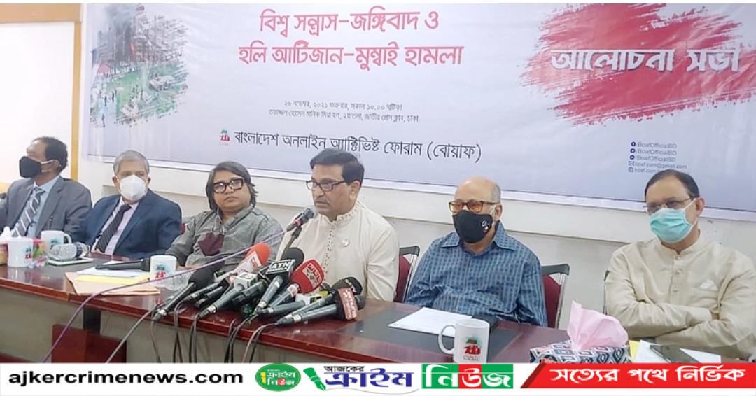 শুক্রবার (২৬ নভেম্বর) জাতীয় প্রেস ক্লাবের তফাজ্জল হোসেন মানিক মিয়া হলে ‘বিশ্ব সন্ত্রাস-জঙ্গিবাদ ও হলি আর্টিজান- মুম্বাই হামলা’ শীর্ষক আলোচনা সভায় তিনি এসব কথা বলেন। বাংলাদেশ অনলাইন অ্যাক্টিভিস্ট ফোরাম (বোয়াফ) এ সভার আয়োজন করে।