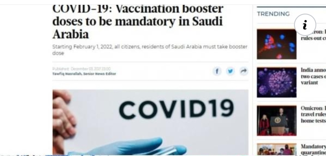 করোনার নতুন ভ্যারিয়েন্ট ওমিক্রন থেকে সুরক্ষা পেতে টিকার বুস্টার ডোজ বাধ্যতামূলক করার ঘোষণা দিয়েছে সৌদি আরব। শুক্রবার (০৩ ডিসেম্বর) সৌদি আরবের স্বরাষ্ট্র মন্ত্রণালয় এক টুইট বার্তার মাধ্যমে এ তথ্য জানিয়েছে। খবর গালফ নিউজের।