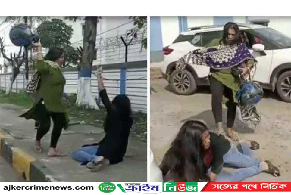 ভিডিওতে দেখা গেছে, স্বামীর ‘প্রেমিকা’কে থানা চত্বরে ঢুকেও মারধর করেন ওই মহিলা। চুলের মুঠি ধরে তাকে রাস্তায় ফেলে মারেন ওই মহিলা।