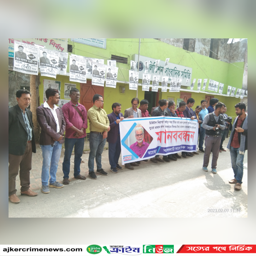 ঝালকাঠি প্রতিনিধি :ঝালকাঠি টেলিভিশন সাংবাদিক সমিতির সামনে ঝালকাঠি সাংবাদিক সমাজের উদ্যোগে ডিজিটাল নিরাপত্তা আইনে সময় টিভির বার্তা প্রধান মুজতবা দানিশ ও রংপুরের ব্যুরো প্রধান রতন সরকারের বিরুদ্ধে মিথ্যা মামলা ও হয়রানির প্রতিবাদে বৃহস্পতিবার সকাল ১১টায় ঘন্টাব্যাপী মানববন্ধন অনুষ্ঠিত হয়। সময় টিভির জেলা প্রতিনিধি পলাশ রায়ের নেতৃত্বে মানববন্ধন কর্মসূচি অনুষ্ঠিত হয়।