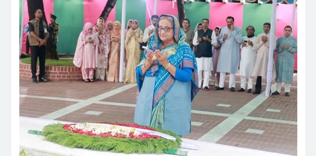 প্রধানমন্ত্রী আজ বিকেলে তার পরিবারের সদস্যদের সাথে নিয়ে বঙ্গবন্ধুর সমাধিতে পুষ্পস্তবক অর্পণ করে বঙ্গবন্ধুর প্রতি গভীর শ্রদ্ধা নিবেদন ও ফাতেহা পাঠ করেন এবং মোনাজাতে অংশ নিয়ে বঙ্গবন্ধু এবং ১৯৭৫ সালের ১৫ আগস্টের হত্যাকান্ডের শিকার অন্যান্য শহীদদের বিদেহী আত্মার শান্তি কামনা করেন। পুষ্পস্তবক অর্পণের পর তিনি বাংলাদেশের স্বাধীনতার স্থপতির স্মৃতির প্রতি গভীর শ্রদ্ধা নিবেদন করে কিছুক্ষণ নীরবে দাঁড়িয়ে থাকেন।
