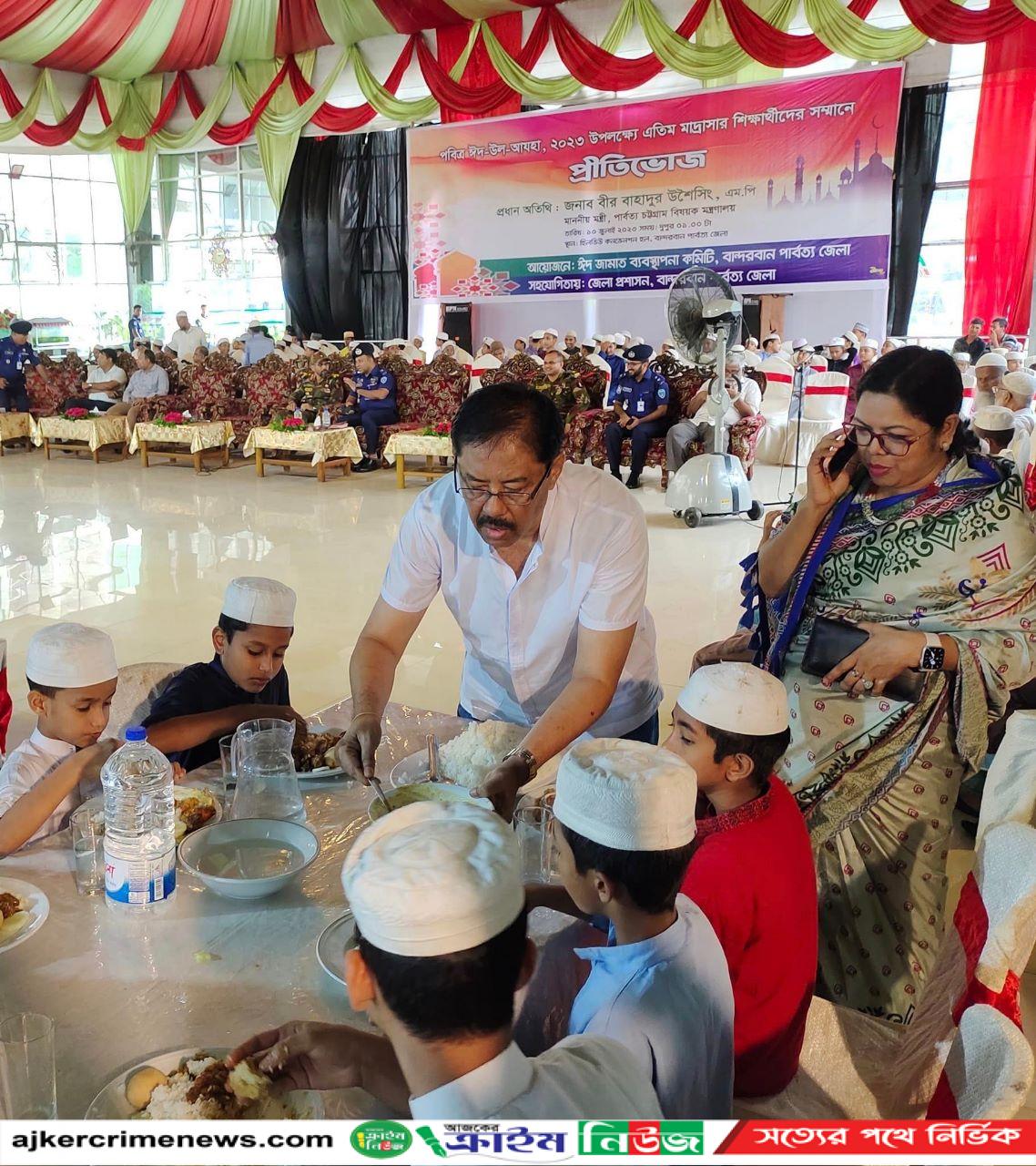 স্থানীয় মাদ্রাসার এতিম শিক্ষার্থী ও শিক্ষকদের মাঝে নিজ হাতে ভালো মানের খাবার পরিবেশন করেন পার্বত্য মন্ত্রী বীর বাহাদুর উশৈসিংএমপি। এসময় মন্ত্রী তাদের খোঁজ খবর নেন এবং কুশল বিনিময় করেন। বান্দরবানে ঈদুল আযহা উপলক্ষে এতিম ও মাদ্রাসার শিক্ষার্থীদের সম্মানে ঈদ জামাত ব্যাবস্থাপনা কমিটি, বান্দরবান পার্বত্য জেলার ব্যবস্থাপনায় এ ধরনের প্রীতিভোজের আয়োজন করা হয়েছে।