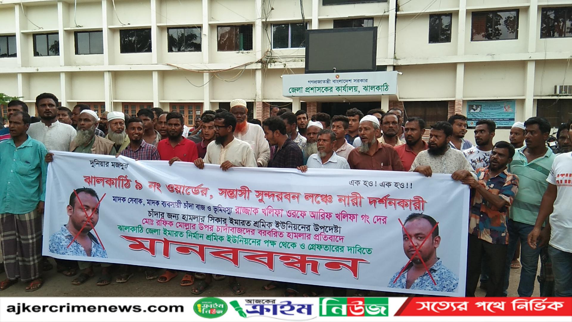 মোঃ মনির হোসেন ঝালকাঠি: ঝালকাঠি জেলা ইমারত ইউনিয়নের উপদেষ্টা মোঃ রফিক মোল্লার উপর হামলার প্রতিবাদে ১৩ই জুলাই বৃহস্পতিবার সকাল ১১ টায় প্রেসক্লাবের সামনে ইমারত শ্রমিকদের মানববন্ধন অনুষ্ঠিত হয়েছে। মানববন্ধন শেষে বিক্ষোভ মিছিল নিয়ে জেলা প্রশাসক কার্যালয়ে সামনে পুনরায় মানববন্ধন করেন। শ্রমিক নেতারা বলেন ঝালকাঠি স্টিমারঘাট এলাকার বিআইডব্লিউটিসি ভবন নির্মাণের কাজ করেন ইমারত নির্মাণ শ্রমিক ইউনিয়নের উপদেষ্টা ও সাব কন্ট্রাক্টর মোঃ রফিক মোল্লা ।এ সময় লঞ্চঘাট এলাকার মোঃ হক খলিফার ছেলে সদরের পোনাবালিয়া ভুমি অফিস সহায়ক রাজ্জাক খলিফা ওরফে আরিফ খলিফা ইমারত শ্রমিক ইউনিয়নের উপদেষ্টা মো:রফিক মোল্লার কাছে বুধবার বিকেলে শহরের বান্দাঘাট এলাকায় চাদা দাবি করেন রফিক মোল্লা চাঁদা দিতে অস্বীকার করায় তার উপর হামলা করে সঙ্গে থাকা শ্রমিকদের বেতন প্রায় ১লক্ষ ৩০হাজার টাকা ছিনিয়ে নিয়ে যায়। হামলাকারীরা হলো আরিফ খলিফা ,রাজিব খলিফা, আমিন খলিফা পিতা:আ:হক খলিফা ,সুজন ঋষি , সজল ঋষি হৃদয় ঋষি পিতা: তপন ঋষি নুর আলম পিতা :ইউসুফ ,সামছু পিতা অজ্ঞাত এছাড়াও অজ্ঞাতনামা ৩-৪ জন ছিল।