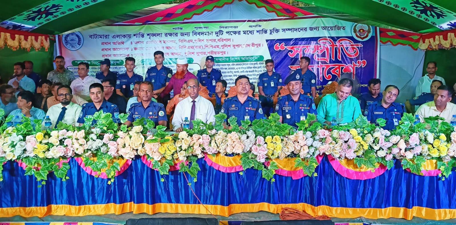 যার প্রেক্ষিতে উভয় পক্ষের লোকজনের বিরোধপূর্ণ এলাকায় সহাবস্থান নিশ্চিত ও শান্তি প্রতিষ্ঠার লক্ষ্যে স্থানীয় লোকজনের সহায়তায় অদ্য ২২-০৭-২০২৩ খ্রি. তারিখ ১৫.০০ ঘটিকায় বরিশাল জেলার মুলাদী থানাধীন ১নং বাটামারা ইউনিয়নের জাগরণী স্কুল মাঠে বরিশাল জেলা পুলিশের উদ্যোগে সম্প্রীতি সমাবেশ অনুষ্ঠিত হয়। উক্ত সম্প্রীতি সমাবেশ জনাব মাহাবুবুর রহমান, অফিসার ইনচার্জ, মুলাদী থানা, বরিশাল এর সভাপতিত্বে উক্ত সম্প্রীতি সমাবেশের কার্যক্রম শুরু হয়। উক্ত অনুষ্ঠানের প্রধান অতিথি হিসেবে জনাব ওয়াহিদুল ইসলাম, বিপিএম, পুলিশ সুপার, বরিশাল; প্রধান আলোচক হিসেবে জনাব মোঃ মাসুদ আলম, বিপিএম (বার), পিপিএম, পুলিশ সুপার, মাদারীপুর; জনাব মোঃ মাহবুবুল আলম, পুলিশ সুপার, শরীয়তপুর। তাছাড়া বিশেষ অতিথি হিসেবে উপস্থিত ছিলেন বাটামারা ইউনিয়নের কৃতি সন্তান কুমিল্লা বিশ্ববিদ্যালয়ের ট্রেজারার প্রফেসর ডক্টর মোহাম্মদ আসাদুজ্জামান; বাটামারা ইউনিয়নের কৃতি সন্তান জনাব বেলাল হোসেন তারা মিয়া, বিজ্ঞ জেলা ও দায়রা জজ সাতক্ষীরা; টুমচর সাকিনের কৃতি সন্তান এ.কে.এম ইমরানুর রহমান, বিজ্ঞ জুডিশিয়াল ম্যাজিস্ট্রেট, ঝালকাঠি; টুমচর সাকিনের কৃতি সন্তান জনাব মহাসিন উদ্দিন, উপজেলা নির্বাহী কর্মকর্তা গোপালগঞ্জ উপজেলা সদর; জনাব মোঃ তারিকুল হাসান মিঠু, উপজেলা চেয়ারম্যান মুলাদী; জনাব মোহাম্মদ কামরুল হাসান, অতিরিক্ত পুলিশ সুপার (প্রশাসন ও অর্থ), মাদারীপুর; জনাব মোঃ শাহ্জাহান হোসেন, পিপিএম, অতিরিক্ত পুলিশ সুপার (প্রশাসন ও অর্থ), বরিশাল; জনাব মোহাম্মদ বদিউজ্জামান, অতিরিক্ত পুলিশ সুপার (ক্রাইম অ্যান্ড অপস্) শরীয়তপুর; জনাব বকুল চন্দ্র কবিরাজ, উপজেলা নির্বাহী অফিসার, মুলাদী উপজেলা বরিশাল; জনাব মতিউর রহমান, সিনিয়র সহকারী পুলিশ সুপার, মুলাদী সার্কেল বরিশাল; জনাব মোঃ আসলাম সিকদার, অফিসার ইনচার্জ, গোসাইরহাট থানা, শরীয়তপুর; জনাব মোঃ আফজাল হোসেন, অফিসার ইনচার্জ, গৌরনদী থানা, বরিশাল; অফিসার ইনচার্জ কালকিনি থানা, মাদারীপুর; মুলাদী প্রেসক্লাবের সভাপতি, জনাব সুমন রাড়ী; বাটামারা ইউনিয়নের চেয়ারম্যান, সালাউদ্দিন অশ্রু; সফিপুর ইউনিয়নের চেয়ারম্যান, হিমু মুন্সী; টুমচর সাকিনের এ্যাডভোকেট মোঃ দুদুমিয়া ও অ্যাডভোকেট তরিকুল ইসলাম পলাশ; বাটামারা ইউনিয়নের সাবেক চেয়ারম্যান, কমর উদ্দিন; মুলাদী উপজেলা পরিষদের ভাইস চেয়ারম্যান, কাজী মাইনুল আহসান সবুজ; বীর মুক্তিযোদ্ধা জনাব হারুন অর রশিদ, সভাপতি মুলাদী উপজেলা জাতীয় পার্টিসহ আরো গণ্যমান্য ব্যক্তিবর্গ উপস্থিত ছিলেন। এই সম্প্রীতি সামাবেশে বিরোধীয় দু’পক্ষের মধ্যে শান্তি প্রতিষ্ঠার লক্ষ্যে এলাকার গণ্যমান্য ব্যক্তিবর্গের মধ্যস্থতায় শান্তি চুক্তিনামা স