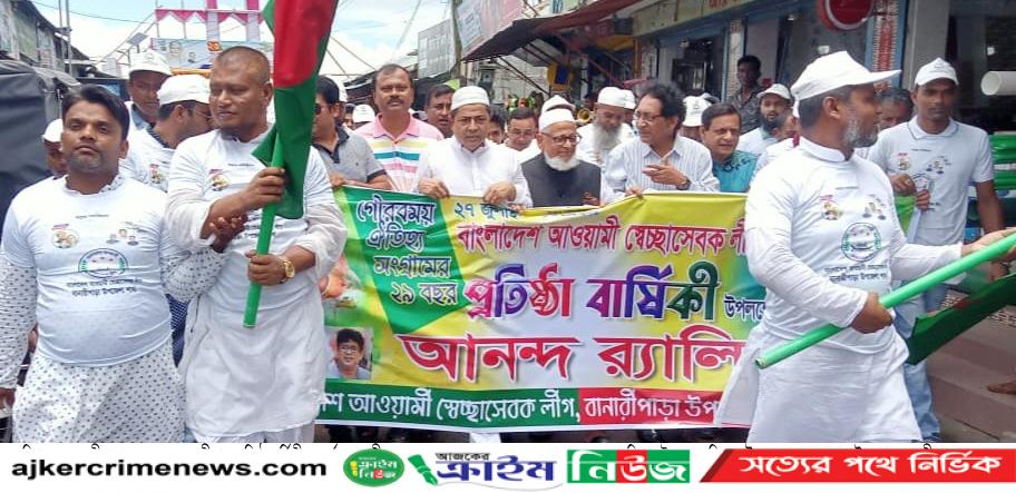 বরিশালের বানারীপাড়ায় বর্ণাঢ্য আয়োজনে বাংলাদেশ আওয়ামী স্বেচ্ছাসেবক লীগের ২৯তম প্রতিষ্ঠাবার্ষিকী উদযাপন করা হয়েছে। এ উপলক্ষে ২৭ জুলাই বৃহস্পতিবার সকাল ১০ টায় উপজেলা আওয়ামী লীগ কার্যালয়ের সামনে জাতির পিতা বঙ্গবন্ধু শেখ মুজিবুর রহমানের প্রতিকৃতিতে পুষ্পার্ঘ অর্পণ করে অনুষ্ঠানের সূচনা করা হয়। পরে দলীয় কার্যালয়ে উপজেলা স্বেচ্ছাসেবক লীগের সভাপতি এইচ এম হাফিজুর রহমান মামুনের সভাপতিতে¦ অনুষ্ঠানে প্রধান অতিথির বক্তব্য রাখেন বরিশাল জেলা আওয়ামী লীগের আইন বিষয়ক সম্পাদক ও বানারীপাড়া পৌর মেয়র এ্যাডভোকেট সুভাষ চন্দ্র শীল। বিশেষ অতিথির বক্তব্য রাখেন উপজেলা আওয়ামী লীগের সাধারণ সম্পাদক এ্যাডভোকেট মাওলাদ হোসেন সানা,সহ-সভাপতি এটিএম মোস্তফা সরদার,যুগ্ম সাধারণ সম্পাদক সুব্রত লাল কুন্ডু,সাংগঠনিক সম্পাদক ও উপজেলা ভাইস চেয়ারম্যান মোঃ নুরুল হুদা,পৌর আওয়ামী লীগের সম্পাদক শেখ সহিদুল ইসলাম,উপজেলা আওয়ামী লীগের সদস্য ও পৌর আওয়ামী লীগের যুগ্ম সম্পাদক রাহাদ সুমন প্রমুখ। উপজেলা স্বেচ্ছাসেবক লীগের সাধারণ সম্পাদক সুলতান সিকদারের সঞ্চালনায় এছাড়াও অন্যান্যের মধ্যে বক্তব্য রাখেন উপজেলার সলিয়াবাকপুর ইউনিয়ন আওয়ামী লীগের সাধারণ সম্পাদক মোঃ ফারুকজ্জামান ফারুক,উপজেলা স্বেচ্ছাসেবক লীগের সহ-সভাপতি সামসুল আলম,সলিয়াবাকপুর ইউনিয়ন স্বেচ্ছাসেবক লীগের সভাপতি শফিকুল ইসলাম শামিম প্রমুখ। আলোচনা শেষে পৌর শহরে বর্ণাঢ্য র্যালী বের করা হয়। এতে বরিশাল-২ (বানারীপাড়া-উজিরপুর)আসনের আওয়ামী লীগের সাবেক সংসদ সদস্য বীর মুক্তিযোদ্ধা আলহাজ¦ মো.মনিরুল ইসলাম মনি ও পৌর মেয়র অ্যাডভোকেট সুভাষ চন্দ্র শীলসহ স্থানীয় নেতৃবৃন্দ অংশ নেন। র্যালী শেষে দলীয় কার্যালয়ে কেক কাটা হয়। ###