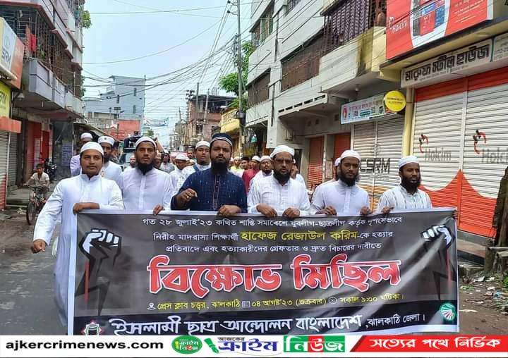 যাত্রাবাড়ী বড় মাদ্রাসার জালালাইন জামাতের মেধাবী শিক্ষার্থী হাফেজ রেজাউল করীমকে গত ২৮ জুলাই ২০২৩ শুক্রবার বাইতুল মোকাররম দক্ষিণ প্রাঙ্গনে ছাত্রলীগ যুবলীগের শান্তি সমাবেশে হত্যার প্রতিবাদে কেন্দ্র ঘোষিত কর্মসূচি প্রত্যেক জেলায় বিক্ষোভ মিছিল এর অংশ হিসেবে আজ ৪ আগস্ট'২৩ইং রোজ শুক্রবার সকাল ৯ টায় ইসলামী ছাত্র আন্দোলন বাংলাদেশ ঝালকাঠি জেলা শাখার উদ্যোগে ঝালকাঠিতে বিক্ষোভ মিছিল অনুষ্ঠিত হয়।