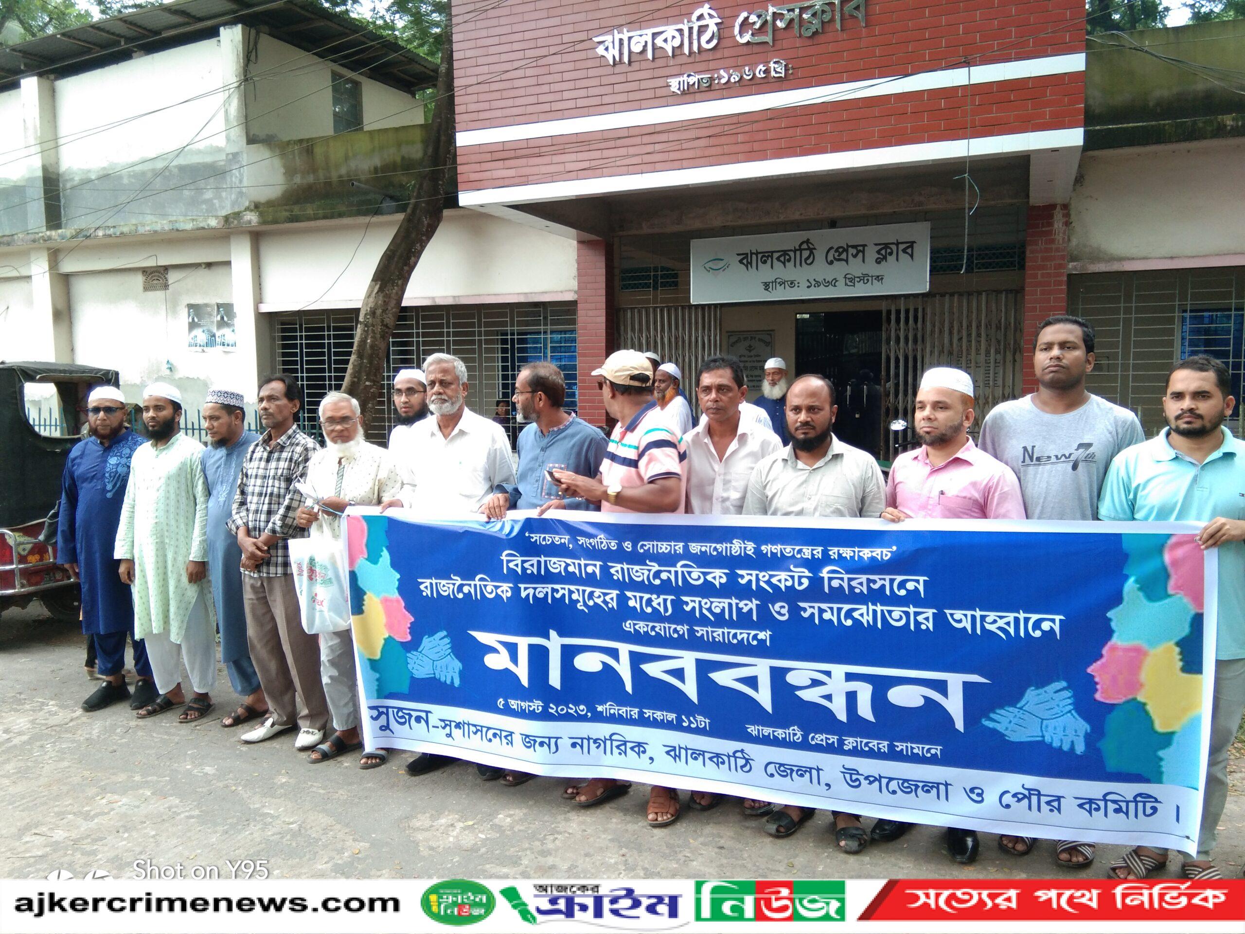 শনিবার (৫ আগস্ট ) সকাল ১১ টার দিকে ঝালকাঠি প্রেসক্লাবের সামনের এ মানবন্ধন অনুষ্ঠিত হয়।