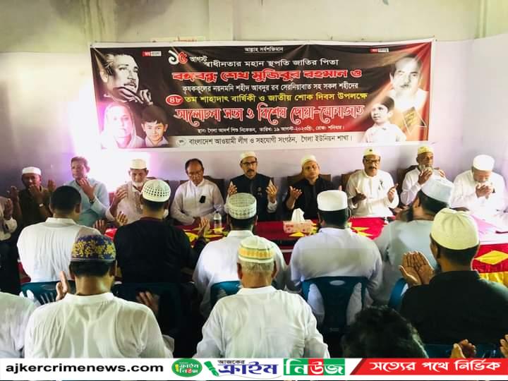 মাস ব্যাপি কর্মসূচির অংশ হিসেবে বরিশালের আগৈলঝাড়ায় আওয়ামী লীগের উদ্যোগে জাতির পিতার ৪৮তম সাহাদাৎ বার্ষিকী ও জাতীয় শোক দিবস উপলক্ষে পুস্পমাল্য নিবেদন, পতাকা উত্তোলন, নীরবতা পালন, কালোব্যাজ ধারন, শোকসভা, দোয়া-মিলাদ ও তোবারক বিতরণ করা হয়েছে। জাতীয় শোক দিবস উপলক্ষে ১৯আগস্ট শনিবার সকাল দশটায় গৈলা মডেল ইউনিয়ন আওয়ামী লীগ ও সহযোগী সংগঠনের আয়োজনে গৈলা শিশু নিকেতন স্কুল মাঠ প্রাঙ্গনে জাতির পিতা বঙ্গবন্ধু শেখ মুজিবুর রহমান, কৃষক লীগের প্রতিষ্ঠাতা শহীদ আব্দুর রব সেরনিয়াবাতের প্রতিকৃতিতে শ্রদ্ধাঞ্জলী নিবেদন করেন উপজেলা ও গৈলা ইউনিয়ন আওয়ামী লীগ নেতৃবৃন্দরা। গৈলা ইউনিয়ন আওয়ামী লীগ সভাপতি হালিমুজ্জান হালিমের সভাপতিত্ব শোক সভায় বক্তব্য রাখেন বরিশাল জেলা আওয়ামী লীগ নেতা ও উপজেলা চেয়ারম্যান বীর মুক্তিযোদ্ধা আব্দুর রইচ সেরনিয়াবাত, উপজেলা আওয়ামী লীগ সভাপতি সুনীল কুমার বাড়ৈ, উপজেলা আওয়ামী লীগের সাধারণ সম্পাদক আবু সালেহ মোঃ লিটন সেরনিয়াবাত।উপজেলা যুবলীগের সহ-সভাপতি আবদুল্লাহ লিটনের সঞ্চালনায় অন্যান্যদের মধ্যে আরও বক্তব্য রাখেন উপজেলা আওয়ামী লীগ নেতা জসীম সরদার, গৈলা ইউপি চেয়ারম্যান শফিকুল হোসেন টিটু, আওয়ামী লীগ নেতা সবুজ আকন, উপজেলা মহিলা আওয়ামী লীগের সাধারণ সম্পাদক মমতাজ বেগম, উপজেলা স্বেচ্ছাসেবক লীগের সভাপতি ফিরোজ সিকদার, যুবলীগের সভাপতি কামরুজ্জামান সেরনিয়াবাত আজাদ, গৈলা ইউনিয়ন আওয়ামী লীগের সাধারণ সম্পাদক তরিকুল ইসলাম চান, উপজেলা ছাত্রলীগ সভাপতি মিন্টু সেরনিয়াবাত, কলেজ ছাত্রলীগের সাধারণ সম্পাদক সৌরভ মোল্লা, ছাত্রলীগ নেতা আসিফ তালুকদার, শিবলু তালুকদার।বাদ যোহর জাতির পিতাসহ সকল শহীদের আত্মার মাগফিরাত কামনায় দোয়া-মোনাজাত পরিচালনা করেন গৈলা বাজার জামে মসজিরে পেশ ইমাম মাওলানা হেদায়েত উল্লাহ। দোয়া মিলাদে উপজেলা আওয়ামী লীগ ও সহযোগী সংগঠনের নেতৃবৃন্দ, ইউপি চেয়ারম্যানবৃন্দ ছাড়াও ইউনিয়ন আওয়ামী লীগ ও সহযোগী সংগঠনের নেতৃবৃন্দরা উপস্থিত ছিলেন।
