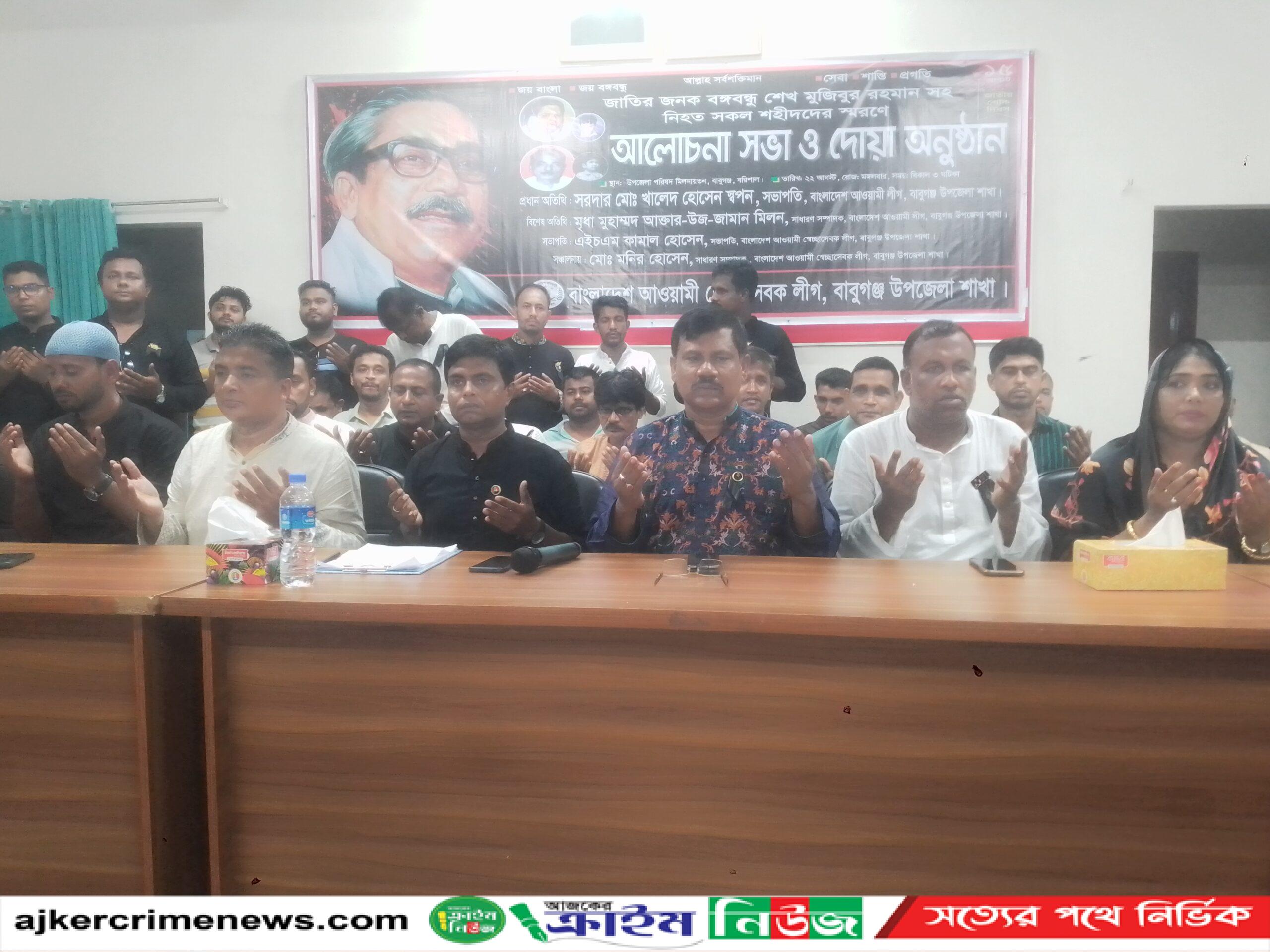মঙ্গলবার বিকাল ৩টায় বাবুগঞ্জ উপজেলা পরিষদ অডিটোরিয়ামে উপজেলা স্বেচ্ছাসেবক লীগ সভাপতি এইচ এম কামাল হোসেন এর সভাপতিত্বে ও সাধারণ সম্পাদক মোঃ মনির হোসেন এর সঞ্চালনায় আলোচনা সভা ও দোয়া অনুষ্ঠানে প্রধান অতিথি হিসেবে উপস্থিত ছিলেন বাবুগঞ্জ উপজেলা আওয়ামী লীগের সভাপতি এস এম খালেদ হোসেন স্বপন।