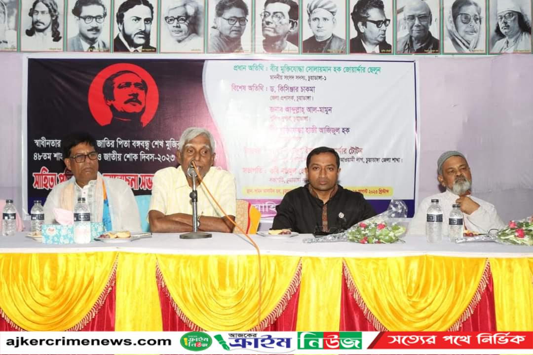 শুক্রবার বিকাল ৫ টায় চুয়াডাঙ্গা সাহিত্য পরিষদের উদ্যোগে শহীদ আলাউল হল রুমে অনুষ্টিত এ অনুষ্টানে সভাপতিত্ব করেন চুয়াডাঙ্গা সাহিত্য পরিষদের সভাপতি কবি নজমুল হেলাল। প্রধান অতিথি হিসেবে উপস্থিত ছিলেন চুয়াডাঙ্গা ১ আসনের সাংসদ বীর মুক্তিযোদ্ধা সোলায়মান হক জোয়ার্দ্দার ছেলুন। বিশেষ অতিথি হিসেবে উপস্থিত ছিলেন চুয়াডাঙ্গা পুলিশ সুপার আব্দুল্লাহ্ আল-মামুন, বিশিষ্ট সমাজ সেবক বীর মুক্তিযোদ্ধা হাজী আজিজুল হক। এ সময় জাতির পিতা বঙ্গবন্ধুর ৪৮তম শাহাদত বার্ষিকী ও জাতীয় শোক দিবসের আবৃত্তি ও চিত্রাঙ্কন প্রতিযোগিতার বিজয়ীদের মাঝে অতিথিদ্বয় পুরস্কার তুলে দেন।