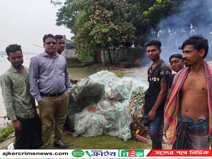 জব্দকৃত অবৈধ জাল জনসম্মুখে পুড়িয়ে ধ্বংস করা হয়।