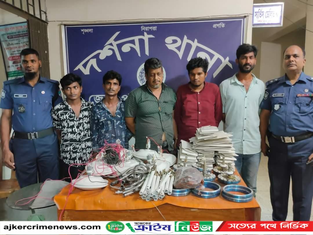 মঙ্গলবার মাঝ রাতে দর্শনা থানার অফিসার ইনচার্জ বিপ্লব কুমার সাহার নেতৃত্বে এসআই(নিঃ) মোঃ শামিম রেজা সঙ্গীয় ফোর্স তথ্য প্রযুক্তির সহায়তায় এবং স্থানীয় সোর্সের তথ্যের ভিত্তিতে দর্শনা পৌর এলাকার কলেজের পিছনে ঘুঘুডাঙ্গার তালতলা পাড়ার শাহিন শরিফের বাড়িতে অভিযান চালায়।এসময় তার ঘরের মধ্যে চাউলের ড্রামের ভিতর অভিনব কায়দায় রাখা ১০টি সিলিং ফ্যানের বডি, ১৫ টি সিলিং ফ্যানের রড, ৩ ১৮টি স্টিলের পানির বেসিনের পাইপ, ২টি কোমডের ফ্লাশ পাইপ, ৩টি ফ্লাশ পাইপের ট্যাব, লাল কালো রংয়ের বৈদ্যতিক তার, ৬টি ক্যাপাসিটার কিছু তার উদ্ধার করে।পরে তার তথ্যের ভিত্তিতে রাতেই দর্শনার মোহাম্মদপুর ভাংড়ি ব্যবসায়ী রফিকুল ইসলাম মিন্টুর ভাংগাড়ির দোকানের পিছনের গোডাউন হতে ৬ কয়েল বক্স, ১২টি বিয়ারিং, ৬টি সিলিং ফ্যানের কয়েল রিং, তামা তার, ৪৫টি সিলিং ফ্যানের পাখা উদ্ধার করে। পরে চোরচক্রের ৫ জনকে বিভিন্নস্থান হতে গ্রেফতার করে। গ্রেফতারকৃত আসামীরা হলো ঘুঘুডাঙ্গার কাশেম শরীফের ছেলে মোঃ শাহিন শরিফ (২৫) ও