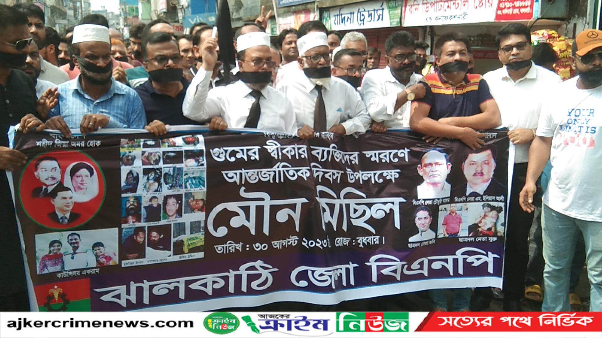 ঝালকাঠি জেলা বিএনপির উদ্যোগে বুধবার ৩০ শে আগস্ট সকাল ১০ টায় জেলা বিএনপির কার্যালয়ের সামনে থেকে জেলা বিএনপির উদ্যোগে আন্তর্জাতিক গুম প্রতিরোধ দিবস ও গুমের শিকার ব্যক্তিদের স্মরণে মুখে কালো কাপড় বেঁধে মৌন মিছিল বের হয়ে শহরের পোস্ট অফিস রোড এলাকায় এসে পুলিশী বাধায় শেষ হয়।
