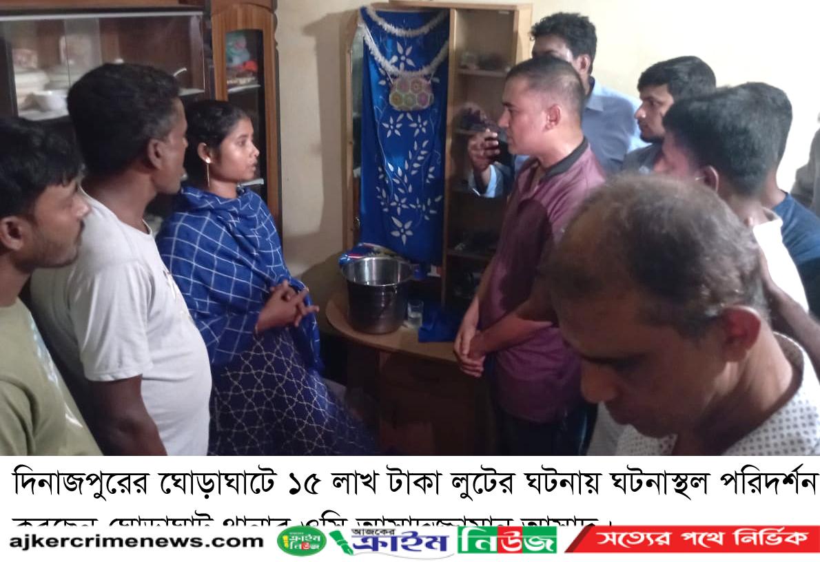 ছবির ক্যাপশন- দিনাজপুরের ঘোড়াঘাটে ১৫ লাখ টাকা লুটের ঘটনায় ঘটনাস্থল পরিদর্শন করছেন ঘোড়াঘাট থানার ওসি আসাদুজ্জামান আসাদ/ ঘরের শোকেসের ড্রয়ার থেকে ১৫ লাখ টাকা নিয়ে গেছে দুর্বৃত্তরা।