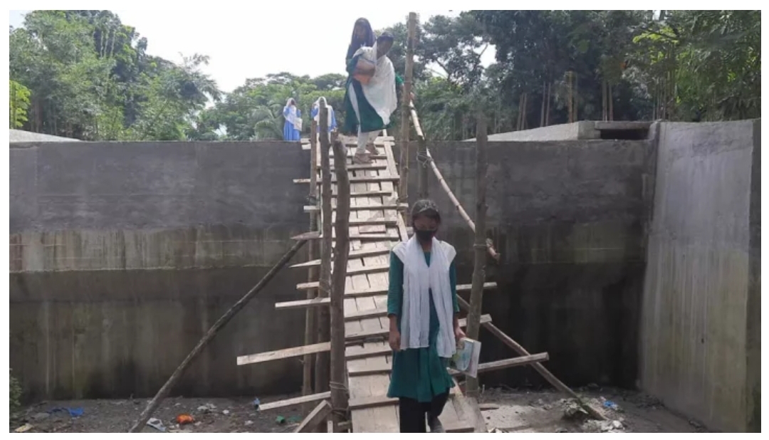উভয় প্রান্তে নড়বড়ে কাঠের মই দিয়ে রেখেছেন ঠিকাদারি প্রতিষ্ঠান। সেই মই দিয়ে সেতুতে ওঠানামা করতে হচ্ছে তিনটি ইউনিয়নের লক্ষাধিক বাসিন্দার।
