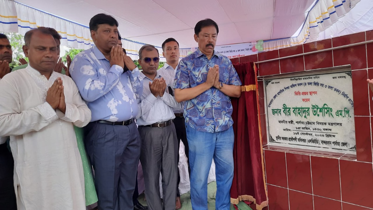 পরে স্থানীয় সরকার প্রকৌশল অধিদপ্তর (এলজিইডি) এর বাস্তবায়নে ৪ কোটি ৪১ লক্ষ ৩৭ হাজার টাকা ব্যয়ে ৩ তলা বিশিষ্ট জেলা প্রাথমিক শিক্ষা অফিস ভবনের ভিত্তিপ্রস্তর স্থাপন কাজের উদ্বোধন করেন পার্বত্য চট্টগ্রাম বিষয়ক মন্ত্রী বীর বাহাদুর উশৈসিং এবং সেখানে এক মতবিনিময় সভায় প্রধান অতিথি হিসেবে যোগ দেন মন্ত্রী।