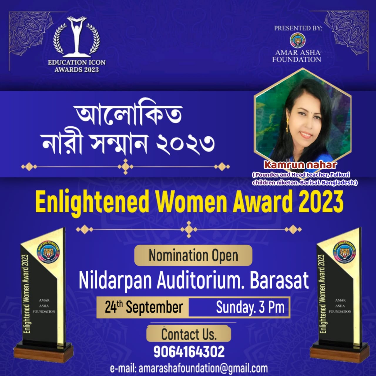 প্রোগ্রামের মঞ্চ থেকে " আলোকিত নারী সন্মান ২০২৩ " সন্মানে সন্মানিত হচ্ছেন সন্মানীয়া বরিশালের আলোকিত শিক্ষক, শেরে বাংলা এ কে ফজলুল হক গবেষণা পরিষদের বরিশাল জেলা সহ সভাপতি, ফুলকুঁড়ি শিশুনিকেতন এর প্রতিষ্ঠাতা প্রধান শিক্ষক কামরুন নাহার।