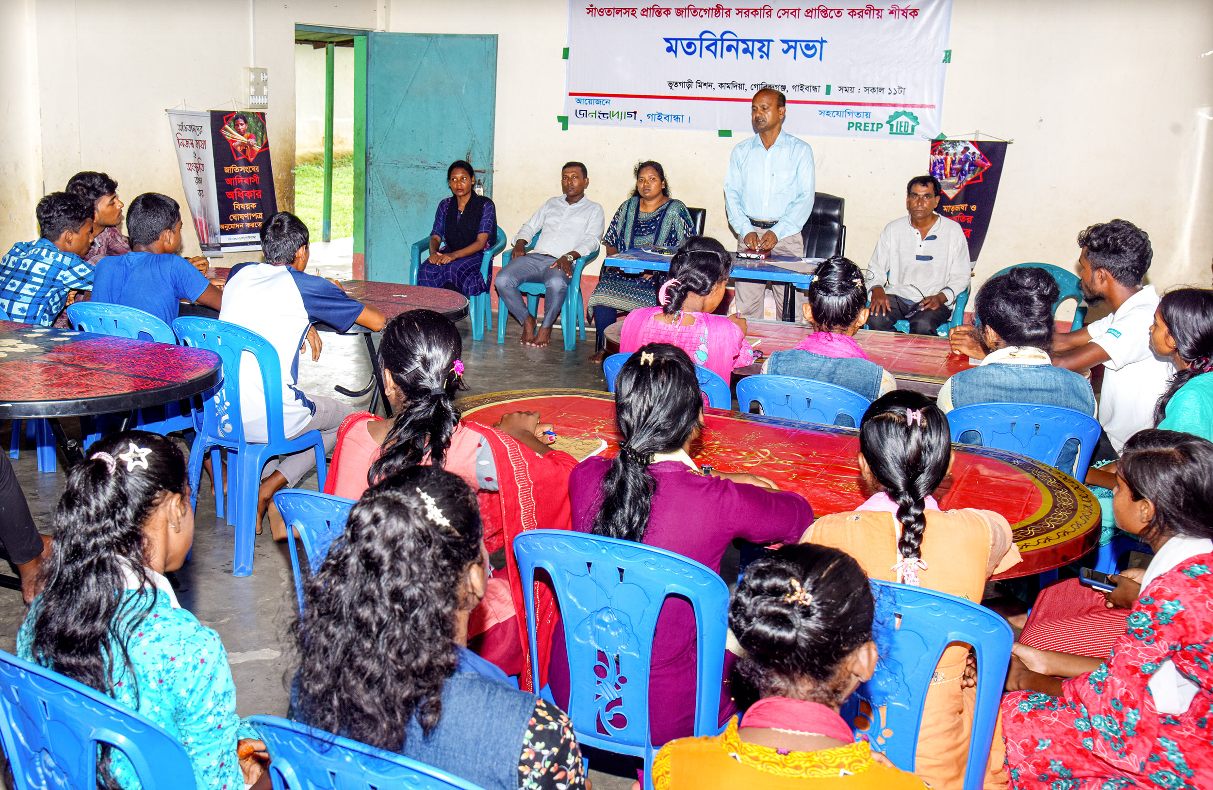 সাঁওতালসহ প্রান্তিক জনগোষ্ঠির সরকারি সেবা প্রাপ্তিতে করণীয় শীর্ষক এক মতবিনিময় সভা গাইবান্ধার গোবিন্দগঞ্জে অনুষ্ঠিত হয়েছে। নাগরিক সংগঠন জনউদ্যোগ গাইবান্ধা জেলা কমিটির উদ্যোগে সাঁওতাল যুব নারী-পুরুষদের সাথে এ মতবিনিময় বুধবার অনুষ্ঠিত হয়। গোবিন্দগঞ্জ উপজেলার কামদিয়া ইউনিয়নের ভুতগাড়ী মিশনে দিনব্যাপী এ মতবিনিময় সভায় জনউদ্যোগ যুব ফোরামের ৫০ জন তরুণ তরুনী অংশগ্রহণ করে।