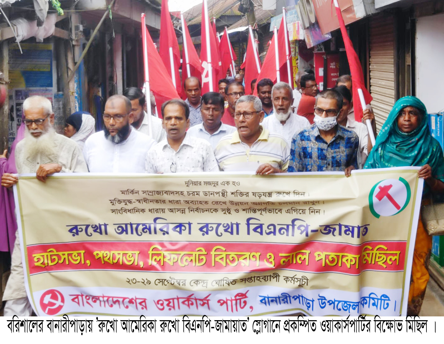 রাহাদ সুমন,বিশেষ প্রতিনিধি॥ বরিশালের বানারীপাড়ায় বাংলাদেশের ওয়ার্কার্স পার্টির কেন্দ্র ঘোষিত দেশব্যাপী কর্মসূচির অংশ হিসেবে লিফলেট বিতরণ, বিক্ষোভ মিছিল ও সমাবেশ অনুষ্ঠিত হয়েছে। ২৯ সেপ্টেম্বর শুক্রবার বেলা ১১ টায় বানারীপাড়া উপজেলা ওয়ার্কার্স পার্টির উদ্যোগে “রুখো আমেরিকা রুখো বিএনপি-জামায়াত” স্লোগানে মুক্তিযুদ্ধ ও স্বাধীনতার ধারা অব্যাহত রেখে উন্নয়ন অগ্রগতি চলমান রাখার দাবীতে বিক্ষোভ মিছিল বের করা হয়। মিছিলটি বানারীপাড়া বন্দর বাজারসহ পৌর শহরের প্রধান প্রধান সড়ক প্রদক্ষিন করে কেন্দ্রীয় শহীদ মিনারে গিয়ে শেষ হয়। পরে সেখানে বানারীপাড়া উপজেলা ওয়ার্কার্স পার্টির নেতা সাইফুল ইসলাম বাদলের সভাপতিত্বে অনুষ্ঠিত সমাবেশ বক্তব্য রাখেন বাংলাদেশের ওয়ার্কার্স পার্টি বরিশাল জেলা কমিটির সদস্য বীর মুক্তিযোদ্ধা মোজাম্মেল হক ফিরোজ, ফায়জুল হক বালী ফারাহীন, জহুরুল ইসলাম টুটুল, এইচ,এম হারুন বাংলাদেশ যুব মৈত্রী কেন্দ্রীয় কমিটির সদস্য রফিকুল ইসলাম,বরিশাল জেলা কমিটির সহ- সভাপতি আলমগীর হোসেন মৃধা,সদস্য জাহিদ হোসেন খান ফারুক, বানারীপাড়া উপজেলা যুবমৈত্রী আহবায়ক হাবিবুর রহমান প্রমুখ। সমাবেশে বক্তারা বলেন,স্বাধীনতা বিরোধী সাম্প্রদায়িক অপশক্তির বিরুদ্ধে ওয়ার্কার্স পার্টি চলমান লড়াইয়ে দেশের সকল অস্প্রদায়িক গনতন্ত্রমনা জনগণকে ঐক্যবদ্ধ করে বিএনপি জামাতসহ সাম্রাজ্যবাদী আমেরিকার সকল ধরনের ষড়যন্ত্র রুখে দিয়ে সাংবিধানিক ধারায় আসন্ন দ্বাদশ জাতীয় সংসদ নির্বাচন শেষ করে দেশের চলমান উন্নয়ন অগ্রগতির ধারা অব্যাহত রাখতে হবে। ###