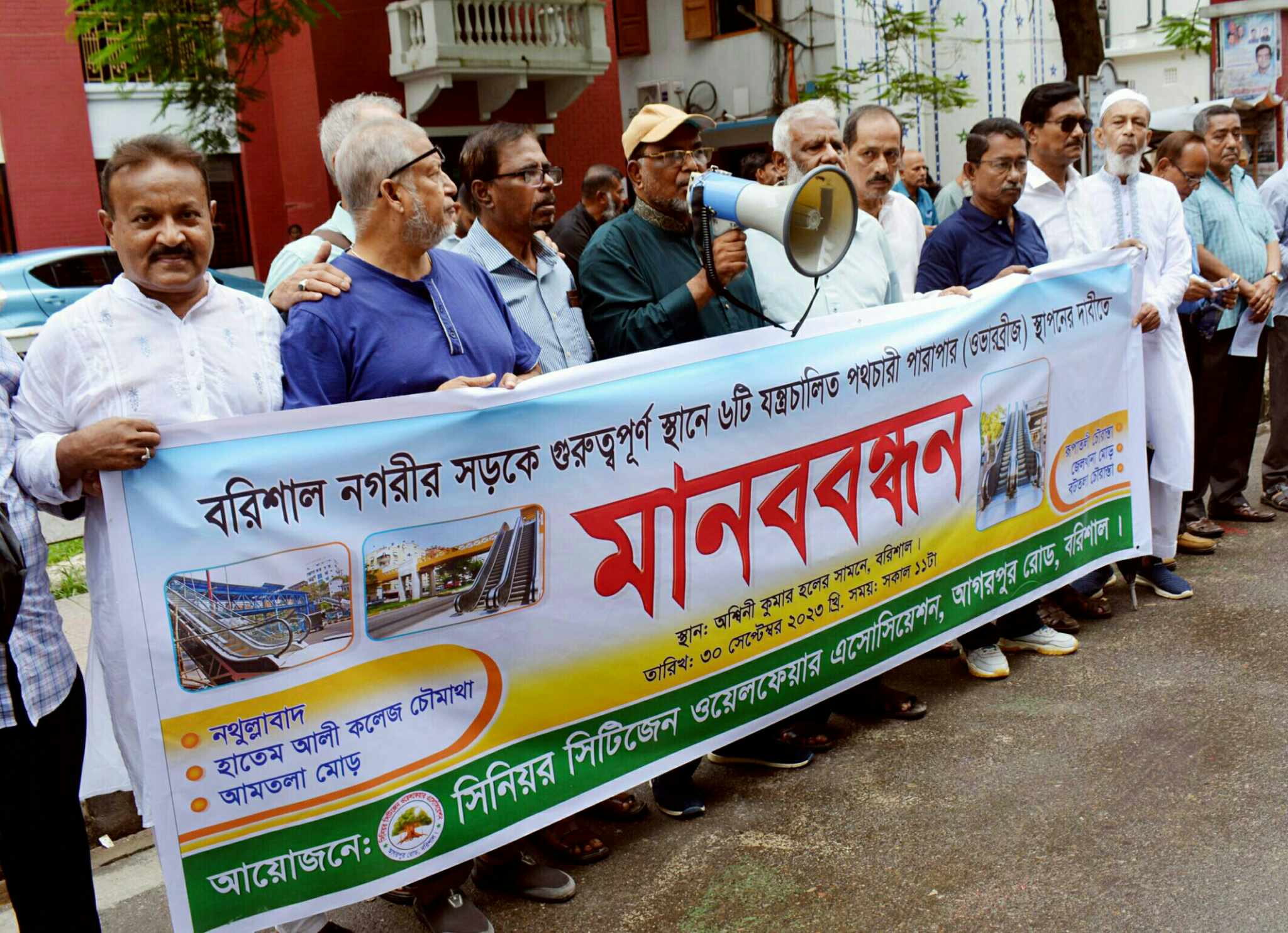 বরিশাল নগরীতে গুরুত্বপূর্ণ সড়কগুলো হলো নতুল্লাবাদ, সরকারী হাতেম আলী কলেজ চৌমাথা,আমতলা মোড়,বটতলা চৌমাথা,জেলখানার মোড় রুপাতলী মোড় সহ নগরীর গুরুত্বপূর্ণ স্থানে ৭টি যন্ত্রচালিত পথচারী পারাপার (ওভার ব্রীজ) স্থাপনের দাবীতে মানববন্ধন কর্মসূচি পালন করে আগুরপুররোডস্থ সিনিয়র সিটিজেন ওয়েলফেয়ার এসোসিয়েশন বরিশাল কমিটি।