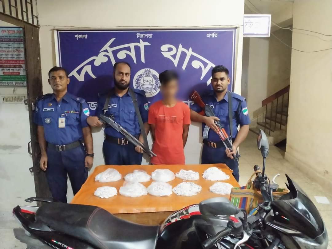 শনিবার দুপুর পৌনে ৩ টার দিকে দর্শনা থানার অফিসার ইনচার্জ বিপ্লব কুমার সাহার নেতৃত্বে দর্শনা থানার এসআই(নি:) খান আঃ রহমান সঙ্গীয় অফিসার ও ফোর্সসহ চোরাচালান প্রতিরোধ ডিউটি পরিচালনাকালে গোপন সংবাদের ভিত্তিতে দর্শনা থানার পারকৃষ্ণপুর-মদনা ইউনিয়নের সীমান্তবর্তী নাস্তিপুর গ্রামে এক অভিযান চালায়। এসময় গ্রামের একটি পেয়ারা বাগানের সামনে থেকে দর্শনা দিকে আসার সময় নাস্তিপুর গ্রামের লিটন মন্ডলের ছেলে মোঃ টিপু মন্ডল(২১)কে একটি মটরসাইকেলসহ আটক করে।পরে মটরসাইকেলে বিশেষ কায়দায় রাখা ১২ কেজি ভারতীয় রুপার তৈরি গহনা ও ব্যবহৃত মোটরসাইকেলটি উদ্ধার করা হয়। পরে গ্রেফতারকৃত আসামীর বিরুদ্ধে দর্শনা থানায একটি মামলা করা হয়েছে।