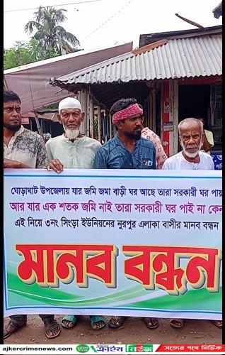 দিনাজপুরের ঘোড়াঘাটে জমি জমা থাকা সত্ত্বেও মমিন নামে এক ব্যক্তিকে আশ্রয়ন প্রকল্পের সরকারি বাড়ি প্রদান করায় সানোয়ার হোসেন নামে এক অস্বচ্ছল ্অসহায় ব্যক্তি বাতিলের প্রতিবাদে উপজেলা নির্বাহী অফিসার বরাবর ্অভিযোগ প্রদান সহ মানব বন্ধন করেছে। সোমবার ৯ ্অক্টোবর বেলা ১১টায় উপজেলার রাণীগঞ্জ বাজার আঞ্চলিক মহা সড়কে এ মানব বন্ধন করে। মানব বন্ধনে বক্তব্য রাখেন, মোঃ সানোয়ার হোসেন,আঃ লতিফ সরকার,আঃমোন্নাফ, মোঃ মহির মাস্টার,রমিচা বেগম,মোঃ নুর আলম,মোঃ জয়নুল আবেদীন ও আরোও অনেকে।