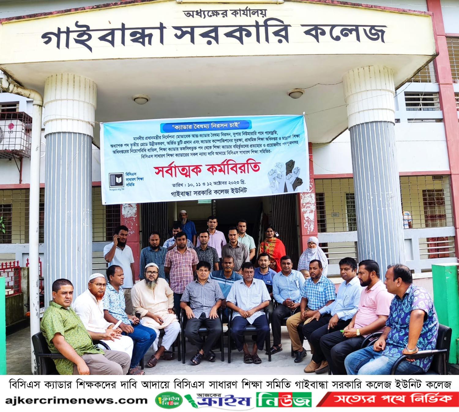 বিসিএস ক্যাডার শিক্ষকদের দাবি আদায়ে বিসিএস সাধারণ শিক্ষা সমিতি কেন্দ্রীয় কমিটির কর্মসূচির অংশ হিসেবে গাইবান্ধা সরকারি কলেজ ইউনিট কলেজ চত্বরে গতকাল বৃহস্পতিবার তিনদিনের সর্বাত্মক কর্মবিরতি শেষ করেছে। কর্মবিরতি চলাকালে বক্তব্য দেন কলেজের অধ্যক্ষ প্রফেসর মো. খলিলুর রহমান, উপাধ্যক্ষ মো. মাহাতাব হোসেন মন্ডল, বিসিএস সাধারণ শিক্ষা সমিতির জেলা ইউনিটের সাধারণ সম্পাদক আনিছা আক্তার বেগম চৌধুরী, নির্বাহী সদস্য প্রফেসর মোঃ আব্দুর রশিদ, যুগ্ম সম্পাদক মোঃ আব্দুল কাইয়ুম আজাদ, কলেজ ইউনিটের সাধারণ সম্পাদক আ.ফ.ম শহীদুর রহমান, যুগ্ম সম্পাদক আব্দুল্লাহ আল মামুন, কোষাধ্যক্ষ মো: ইফতেখারুর রহমান, সহযোগী অধ্যাপক মো: মাসুদুর রহমান, আশরাফুজ্জামান মিলন, মো: আনোয়ার হোসেন, মো: বাবুল আকতার, সহকারী অধ্যাপক মো: মমিনুল ইসলাম, ড. মুহম্মদ মিজানুর রহমান, খন্দকার মশিউর রহমান, আব্দুর রহিম, হারুন অর রশীদ, রায়হানুল ইসলাম পল্লব, প্রভাষক আশফাখুল ইসলাম, মো: সাইফুল ইসলাম, জান্নাতুল ফেরদৌস, শিহাব উদ্দিন, আক্তারুজ্জামান রানা, মো: ওয়াশিম মিয়া, শারমিন চৌধুরী, সাবিনা ইয়াসমিন, রাশেদ মিয়া, রাগীব শাহরিয়ার, আনারুল ইসলাম প্রমূখ।