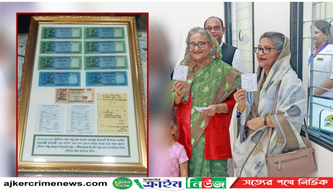 পদ্মা সেতুর উদ্বোধনী ট্রেনে প্রধানমন্ত্রী শেখ হাসিনা ও ছোট বোন শেখ রেহানার কেনা সাত টিকিটের অর্থ বাঁধাই করে রেখেছে রেলওয়ে কর্তৃপক্ষ। গত রোববার রাতে কমলাপুরে ঢাকা রেলওয়ের বাণিজ্যিক দপ্তরে ছবিটি টানানো হয়।