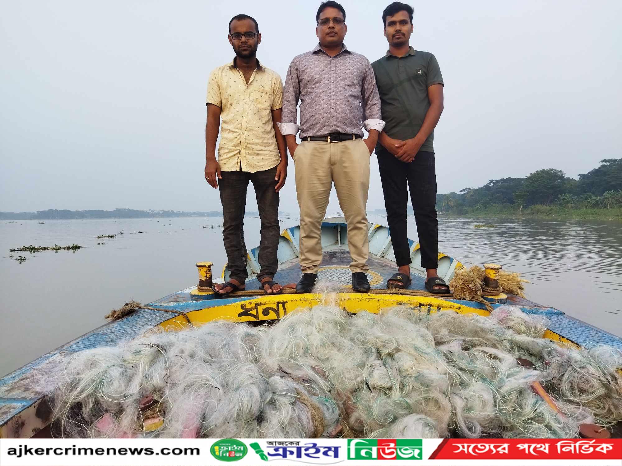 আটককৃত জাল জনসমক্ষে সুগন্ধা নদীর কিনারায় পুড়িয়ে ফেলা হয়।