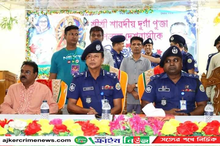 ঝালকাঠি প্রতিনিধি :২০ অক্টোবর ২০২৩ খ্রিঃ শুক্রবার রাতে সনাতন ধর্মাবলম্বীদের সর্ববৃহৎ ধর্মীয় উৎসব শারদীয় দুর্গাপূজার মহাষষ্ঠীর দিনে আইনশৃঙ্খলা পরিস্থিতিসহ সার্বিক নিরাপত্তা পর্যবেক্ষণকল্পে ঝালকাঠি জেলার বিভিন্ন পূজা মন্ডপ পরিদর্শনে যান বরিশাল রেঞ্জের ডিআইজি মোঃ জামিল হাসান, বিপিএম-সেবা, পিপিএম । এসময় তিনি ঝালকাঠি জেলা পূজা উদযাপন কমিটির সাথে এক মতবিনিময় সভায় অংশগ্রহণ করেন এবং পূজাকালীন সময়ে আইন শৃঙ্খলা পরিস্থিতি নিয়ন্ত্রণে পুলিশ সর্বাত্মক সহযোগিতা করবে বলে আশ্বাস প্রদান করেন। এছাড়াও তিনি শতভাগ নিরাপত্তা নিশ্চিতে পুলিশের পাশাপাশি সাধারণ জনগণকে এগিয়ে আসার উদাত্ত আহ্বান জানান।